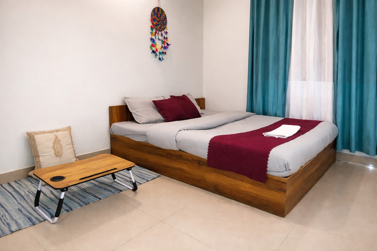 Experience a blend of industrial chic and spiritual serenity in this unique loft-style sanctuary, located just steps away from the iconic Laxman Jhula bridge. Designed for travelers who appreciate open spaces and modern aesthetics, this room offers an airy, elevated retreat in the vibrant heart of Rishikesh.