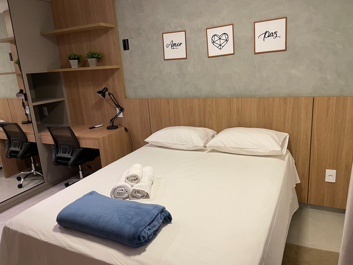 Thư giãn tại nơi độc đáo và yên tĩnh này. Studio hoàn chỉnh với Wi-Fi, TV thông minh, điều hòa, Alexa, đồ dùng nhà bếp, máy pha cà phê, bộ lọc nước, máy sấy tóc, bàn là và mọi thứ khác để tạo sự thoải mái cho bạn. Bạn có thể chọn giữa 2 giường đơn hoặc 1 giường Queen. Tận hưởng các khu vực chung như hồ bơi, thang máy, bãi đỗ xe, nhân viên hỗ trợ 24 giờ, phòng khách để học tập hoặc gặp gỡ và không gian dành cho người sành ăn. Vị trí tuyệt vời, gần Bệnh viện San Francisco và UNAERP College.