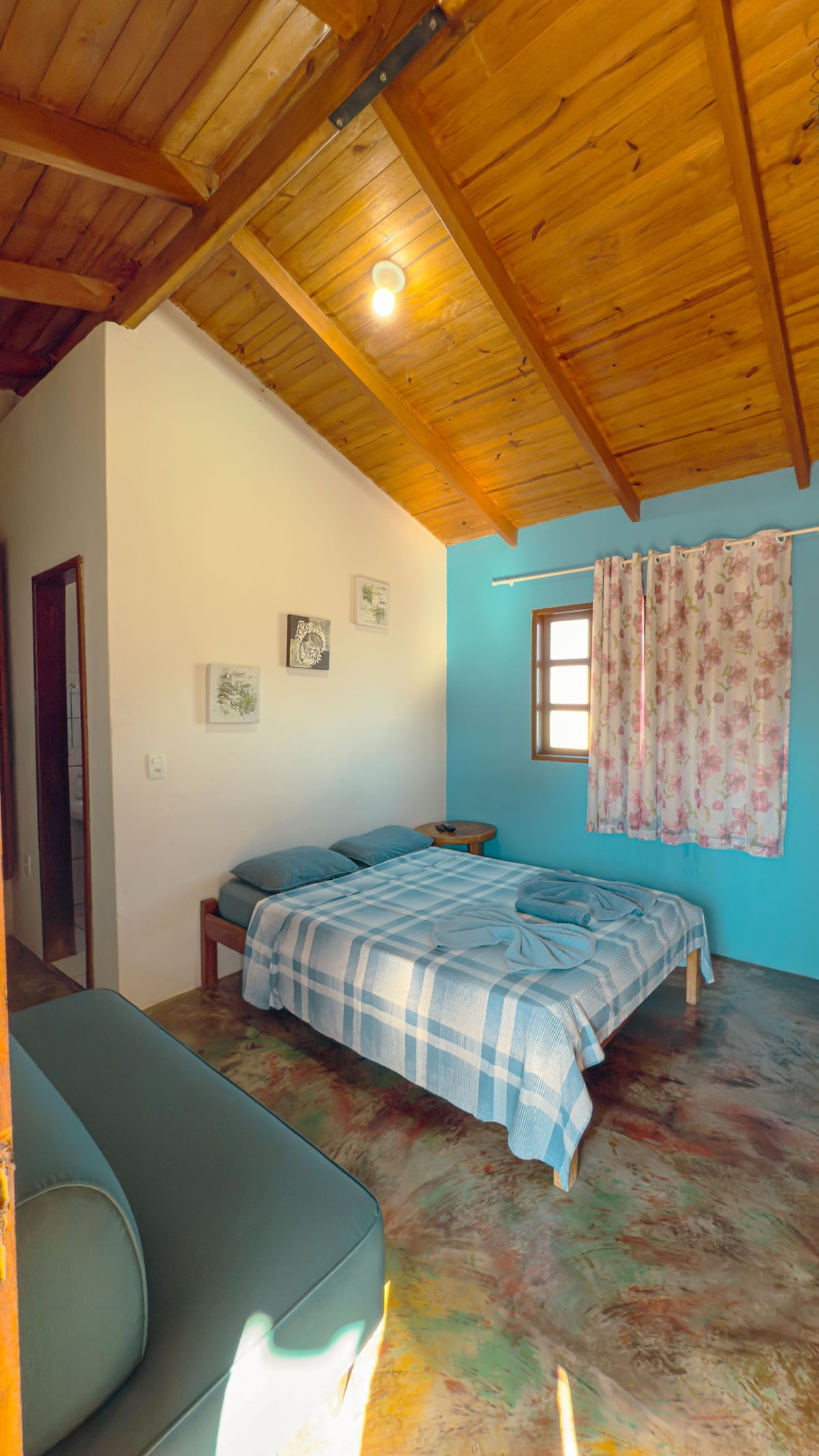 Aconchegante chalé para casal, com banheiro privado! Chalé com banheiro privado, chuveiro de água quente, cama de casal, frigobar, ventilador para dias quentes e armário para guardar suas coisas.