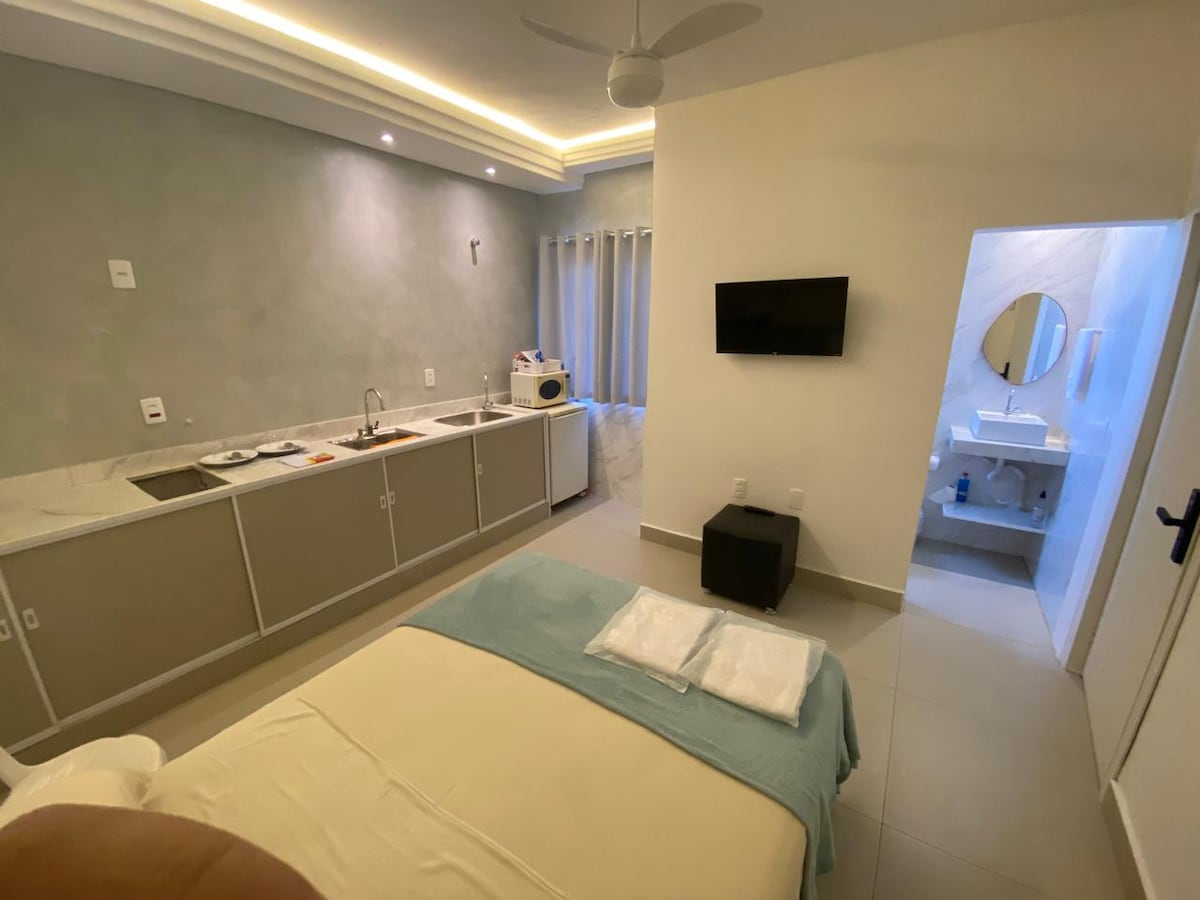 Stúdio ấm cúng, mới, rộng rãi, đang chờ đón bạn. - Phòng suite - Điều hòa nhiệt độ - TV - Bếp có lò vi sóng, minibar, quán cà phê với viên nang, máy làm bánh sandwich, bát đĩa, dao kéo, cốc và ly. - Khăn trải giường và khăn tắm, xà phòng nước, dầu gội đầu và dầu xả - 01 chỗ đỗ xe - Gần hai siêu thị, UEMG, nhà thuốc, diễn đàn, bến xe buýt, trạm xăng, nhà hàng, quán bar, gần trung tâm. Vị trí tuyệt vời. cổng - Cổng điện tử sẽ mang lại sự an toàn và tiện nghi hơn.