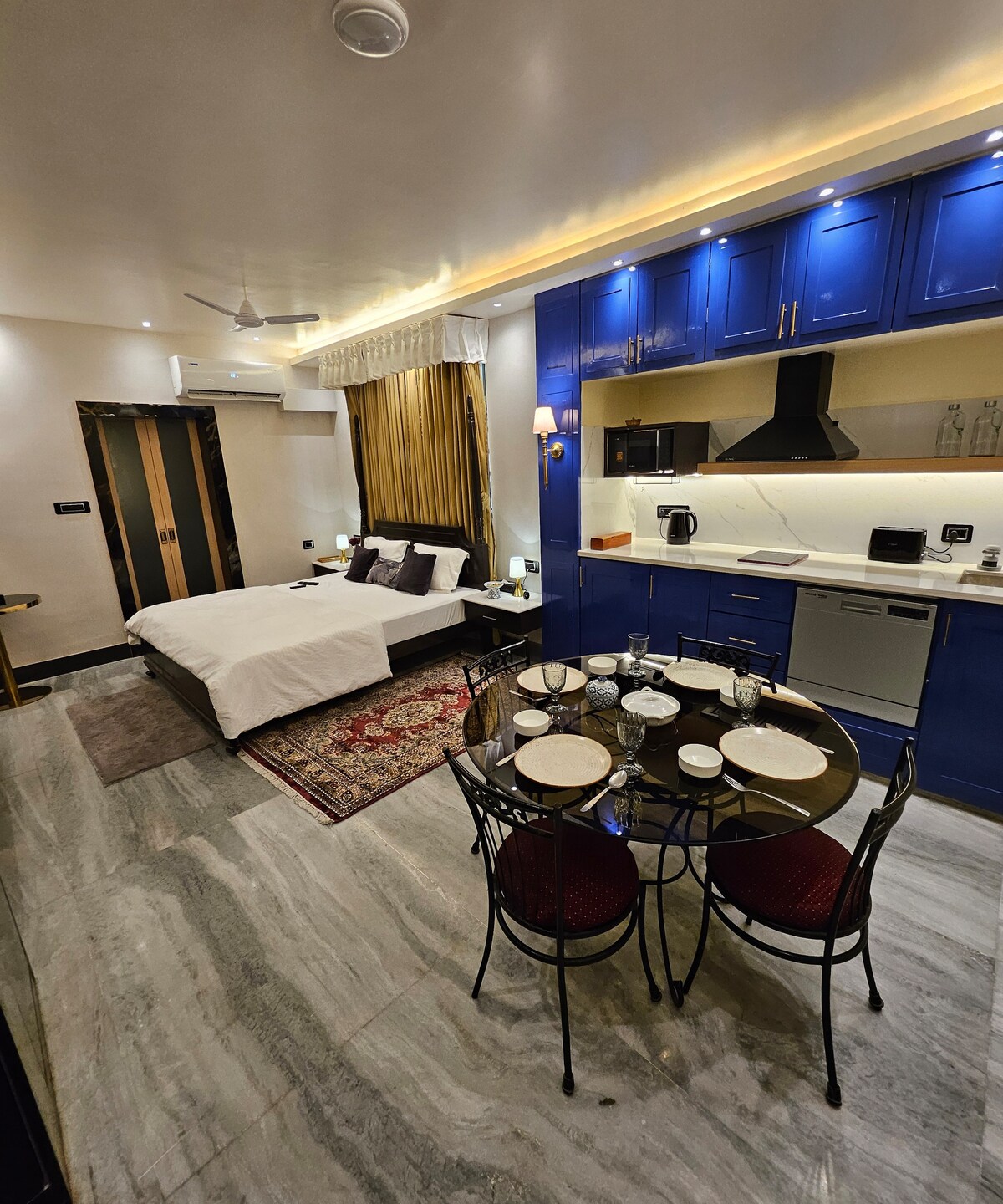 🤝Have fun with the whole family at this stylish place. ■ Spacious 2BHK apartment. 1.Each bedroom has its own washroom 2.Just 10 minutes to the airport 3. 20 minutes from the railway station 4.Located in midtown, easy access to main attractions 5. Ola & Uber available nearby 6.RPS Food delivery from Zomato & Swiggy at your doorstep 7. Grocery stores within walking distance 8. 24/7 staff available on-site for any assistance 9. Private generators for power cuts 10. Free parking.