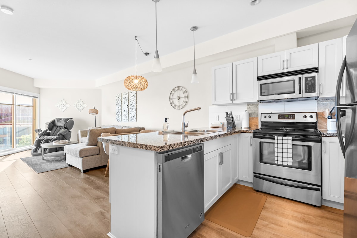 Giấy phép kinh doanh có hiệu lực đến năm 2026 Hồ bơi trong nhà và ngoài trời 2 phòng ngủ (phòng ngủ thứ 2 được chuyển đổi từ một phòng làm việc) 1 phòng tắm có vòi sen đứng Bếp cập nhật với các thiết bị bằng thép không gỉ và mặt bàn lát đá granite 2 ban công hướng đông và tây Wifi & Telus TV với Crave & HBO + Chromecast Không gian làm việc phù hợp với laptop có màn hình Máy giặt và máy sấy Máy pha cà phê và cà phê espresso 1 chỗ đỗ xe ngầm Vị trí trung tâm ở bờ sông trung tâm Kelowna