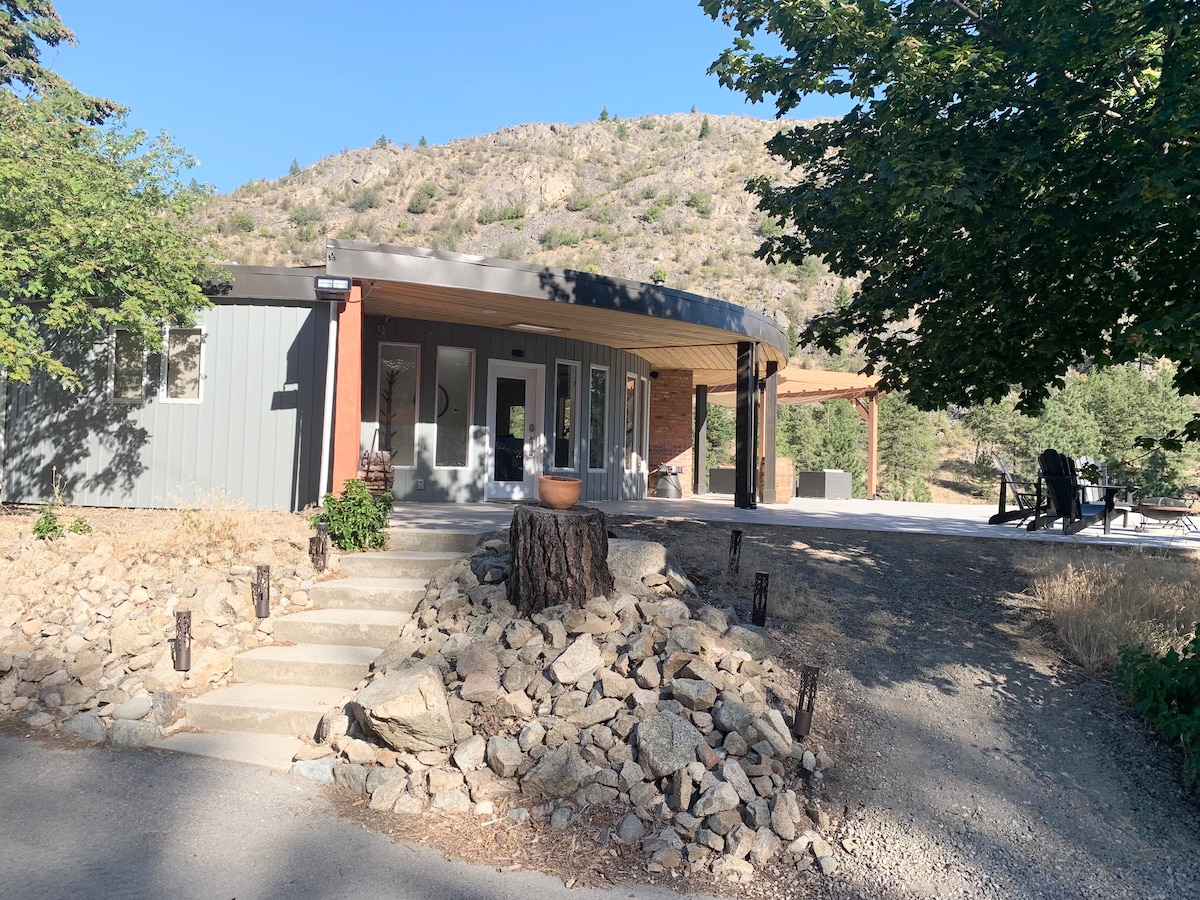 Ngôi nhà tròn độc đáo này nằm giữa một vườn nho, với 64 mẫu cảnh quan thiên nhiên tuyệt đẹp từ trước ra sau của tòa nhà. Bạn sẽ có tầm nhìn ra vườn nho theo sở thích từ sân hiên rộng rãi rộng 2.700 feet vuông và vào mùa hè, ngồi hàng ghế đầu để ngắm nhìn những người đi xe đạp đi qua trong lễ hội Granfondo Axel Merckx Okanagan hàng năm. Chúng tôi cách Sân golf Fairview và thị trấn Oliver vài phút. Cách đó 12 phút lái xe ngắn sẽ đưa bạn đến khu phát triển Wine District Village mới.