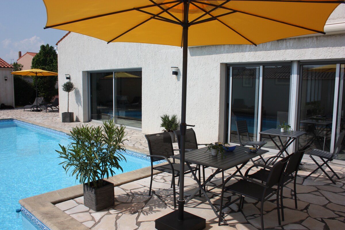Cette villa de style a été réalisée par l'agence d'architecture d'intérieur (husdesign_archideco) que dirige Yann... Morceaux choisis pour le mobilier design (Kartell, Ligne roset, Roche Bobois, Boconcept...) Equipements tels que TV Led, Netflix, enceinte Bose, cuisine équipée, 3 chambres dont 1 en suite, 2 salles de bains, piscine chauffée, cuisine ext. avec plancha, ouvert sur un jardin paysagé plein Sud, sans vis à vis. Caution Airbnb pour ce logement : 2000 euros