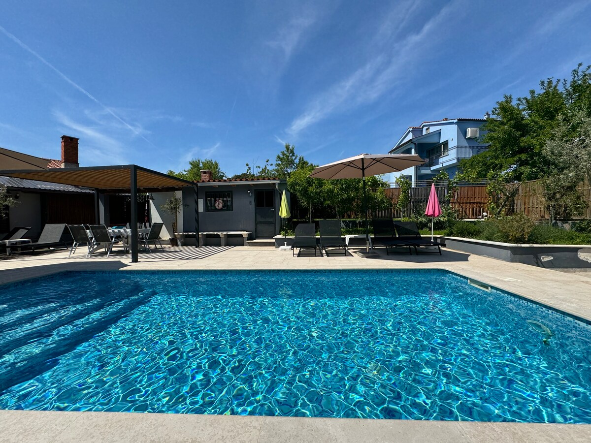 Biệt thự phong cách gần Rovinj với hồ bơi đẹp như tranh vẽ, bồn tắm nước nóng, phòng xông hơi khô. Tỉnh dậy với tầm nhìn toàn cảnh thung lũng xanh tươi. Phù hợp cho các cặp đôi và gia đình, một quãng lái xe ngắn đến công viên phiêu lưu, Công viên quốc gia Brijuni, công viên khủng long, thị trấn thời trung cổ và ẩm thực địa phương. Đó là một nơi nghỉ ngơi xanh thực sự cho bất kỳ ai muốn trở về với thiên nhiên với tất cả sự thoải mái của cuộc sống hiện đại. Được trang bị đầy đủ để nấu ăn và giải trí trong 2600 m2 vườn (bóng đá, bóng tốc độ, cầu lông và hồ bơi) cho trẻ em và người thân của bạn thưởng thức.