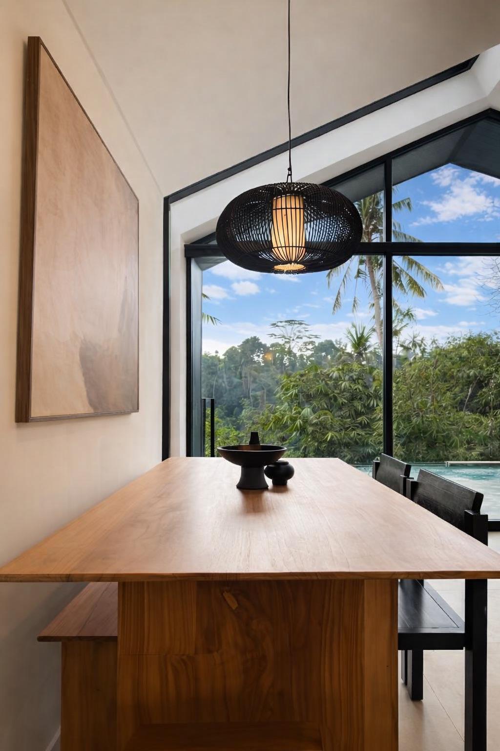 Escape to a serene haven nestled amidst lush greenery. This loft-style villa boasts a king-size bed on a raised platform, overlooking a private infinity pool that blends seamlessly with the jungle view. The ground floor features a spacious living area with a dining table, a well-equipped kitchen, and a stylish bathroom with a bathtub and shower. The large floor to ceiling windows create an inviting and tranquil atmosphere.