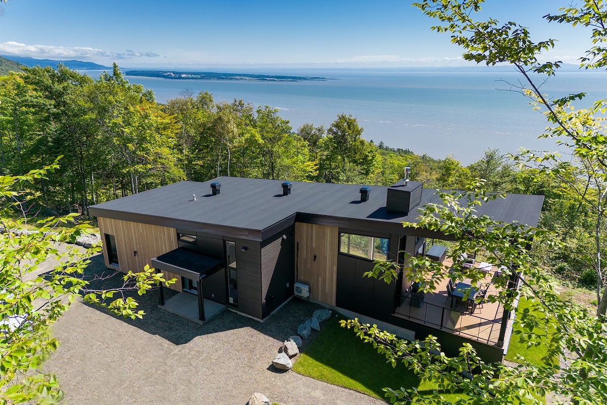 Nhà gỗ kiểu Scandinavia nhỏ cho hai người nằm ở vị trí lý tưởng để tận hưởng các điểm tham quan của Charlevoix. Nó có một mạch nhiệt (bồn tắm nước nóng, phòng xông hơi khô, hammam) Rất thân mật và ở giữa rừng, tầm nhìn ra dòng sông hùng vĩ và những ngọn núi ở phía xa. Tất cả các thiết bị hiện đại đều có ở đó và sự thoải mái là điều hòa nhiệt độ và lò sưởi ngoài trời tuyệt đối. Thiết kế khái niệm mở được thiết kế cho một trải nghiệm đắm chìm trong tự nhiên: cửa sổ lớn, vòi sen toàn cảnh. Ra vào bằng đường riêng ở độ cao 500 m.