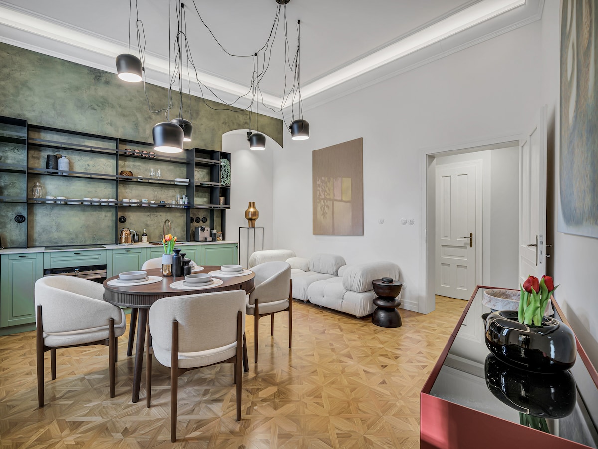 This is your dream apartment in Prague! ✨ Check out our amazing reviews! We offer a beautiful 2-bedroom flat with a spacious living room and kitchen (120 m²) in a historic building with an elevator. Recently renovated, elegantly furnished, fully air-conditioned, and equipped for your perfect stay. Located right in the heart of Prague, just a short walk from Charles Bridge, Dancing House, Petrin Hill, Prague Castle, and the 5-star Novy Smichov shopping center. You’ll fall in love with this place!