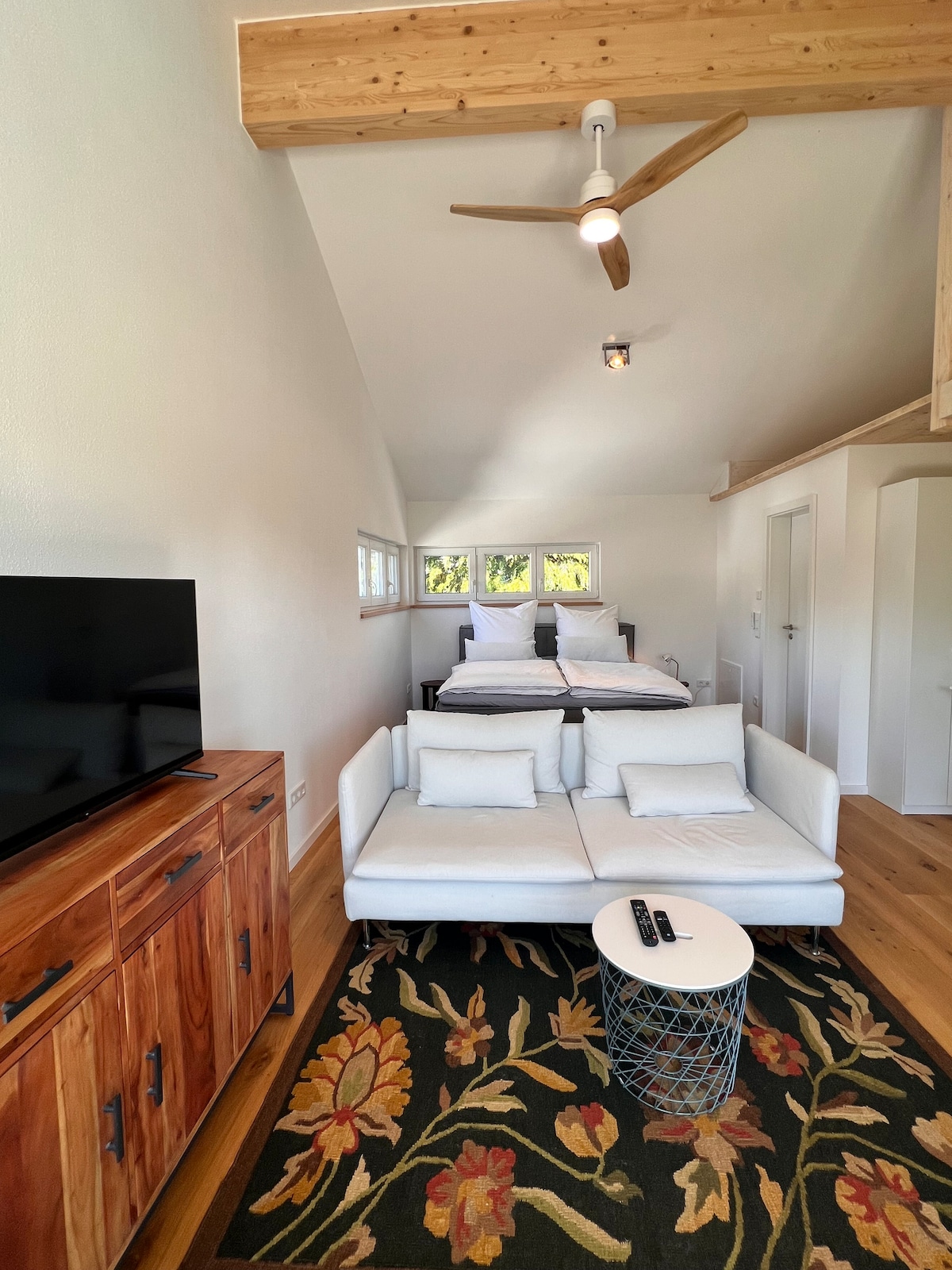 Our “Waldhütte” in the Five Lakes Region/Pfaffenwinkel is perfect for peace and nature – with great access to castles, lakes, mountains, and Munich. Secluded, 200 m from the main house, it offers pure retreat: panoramic views of meadow and forest, a terrace for dining, yoga, or knitting, stargazing from the loft. Inside, a wood stove and infrared heating keep things cozy while foxes and deer pass by outside.