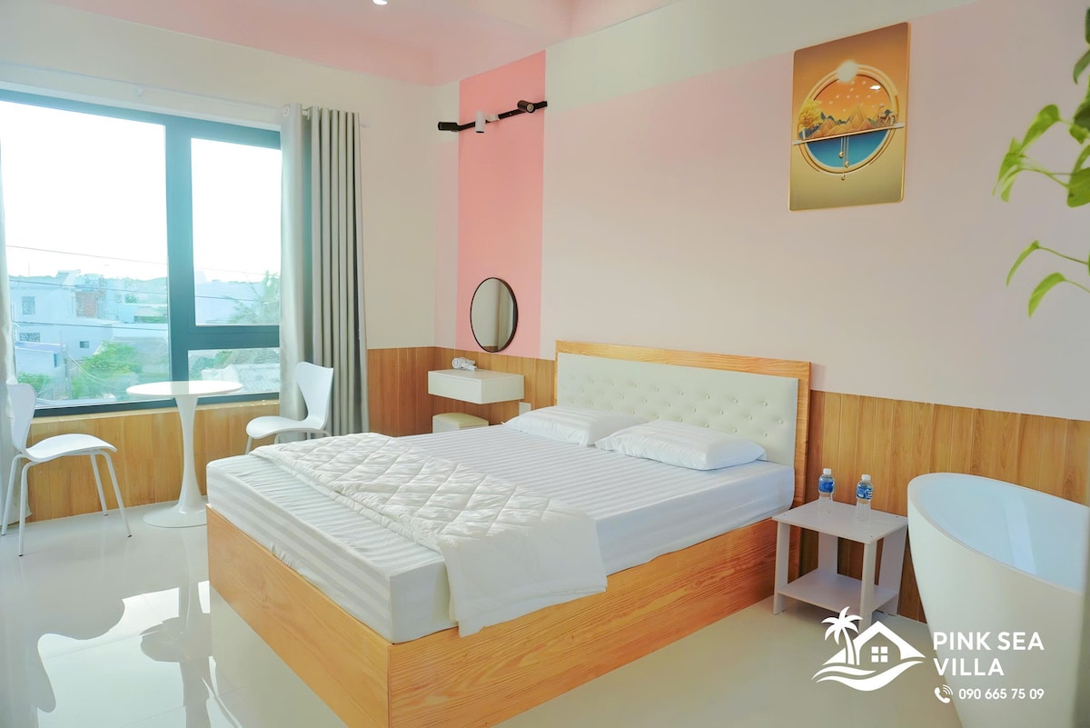 Với không gian phòng rộng 25,5m2 - cho một gia đình hoặc nhóm bạn 4 người trải nghiệm, Ban Công rộng & riêng biệt, Bồn tắm cạnh cửa sổ kính lớn view trực diện biển Tầm nhìn rộng lớn trực diện biển từ Tầng 3 (view Mộ thầy trải dài sang Điện gió)