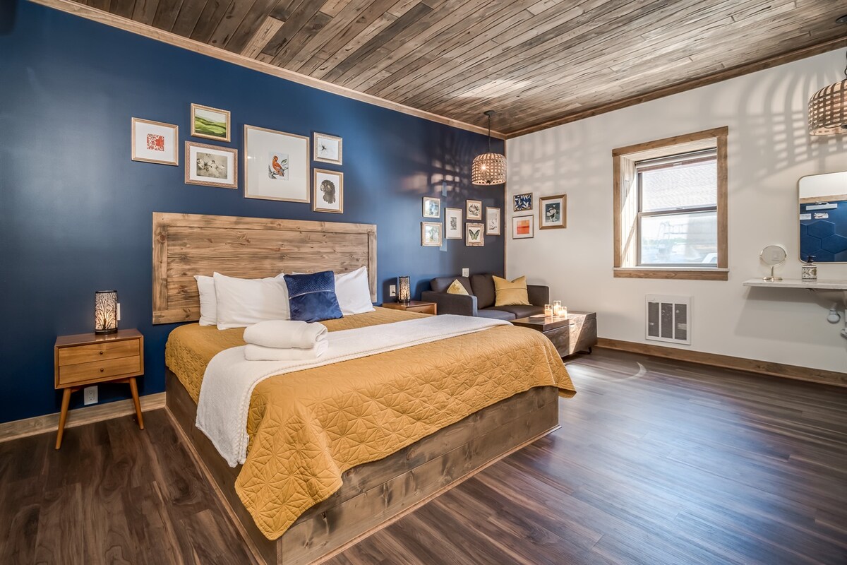 Chốn nghỉ ngơi lãng mạn bên sông Phòng Suite Mississippi được thiết kế cho các cặp đôi muốn sống chậm lại, tái kết nối và thư giãn theo phong cách riêng. Với giường cỡ king ấm cúng, ánh sáng dịu nhẹ và lò sưởi điện nhấp nháy, đây là bối cảnh hoàn hảo cho một kỳ nghỉ lãng mạn. Thưởng thức cà phê buổi sáng cùng nhau từ quầy cà phê trong phòng hoặc kết thúc buổi tối với một bộ phim yên tĩnh trên TV thông minh - chỉ cách trung tâm thành phố quyến rũ và bờ sông đẹp như tranh vẽ của Prescott vài bước.