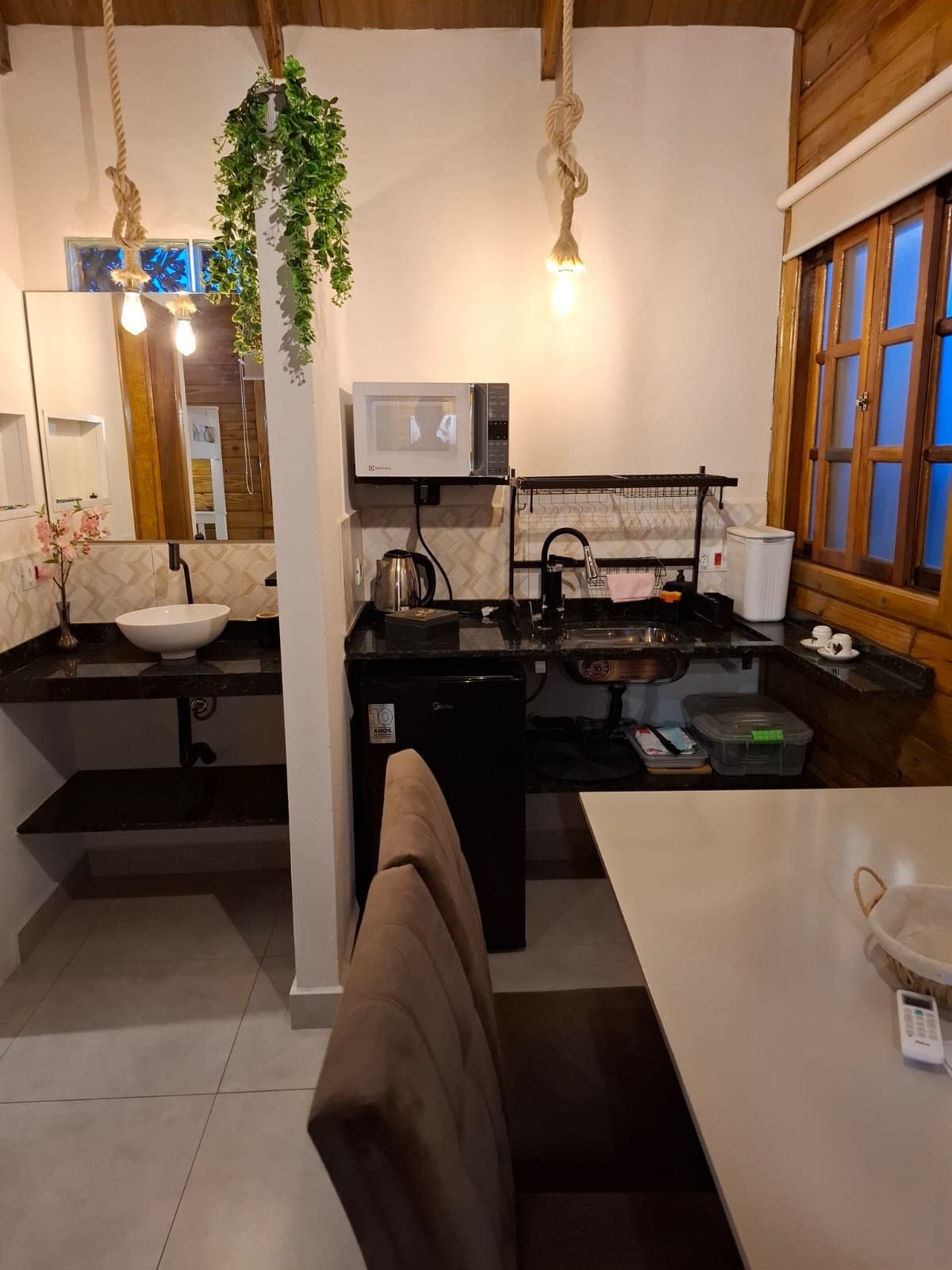 Hospede-se em um chalé confortável e charmoso, com uma beliche com cama de casal e uma cama de solteiro elevada, ambiente acolhedor e bem equipado com uma mini cozinha, microondas, frigobar e chaleira elétrica. Disponibilizamos travesseiros, lençois, cobertores e toalhas. É um espaço ideal para descansar, repor energias e aproveitar momentos especiais.