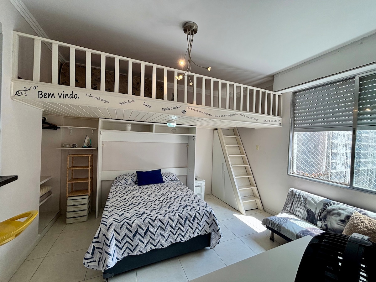 Căn hộ/kitnet ở tầng 11, cách Bãi biển Pitangueiras một dãy nhà, ở góc Rua Mário Ribeiro và Av. Puglisi. Trung tâm thành phố Guarujá, làm mọi thứ bằng cách đi bộ. Có thể ở tối đa 4 người, bao gồm cả trẻ sơ sinh, toàn bộ không gian có phòng tắm. Phòng có GIƯỜNG đôi, GHẾ SOFA GIƯỜNG, điều hòa không khí, bếp đầy đủ tiện nghi và bếp điện. Ổ cắm 110V. Tòa nhà có gara với người phục vụ 24 giờ (để lại chìa khóa), dịch vụ bãi biển (ghế và 1 ô) và dọn phòng hàng ngày. ↓ ĐỌC KỸ TRƯỚC KHI ĐẶT PHÒNG ↓