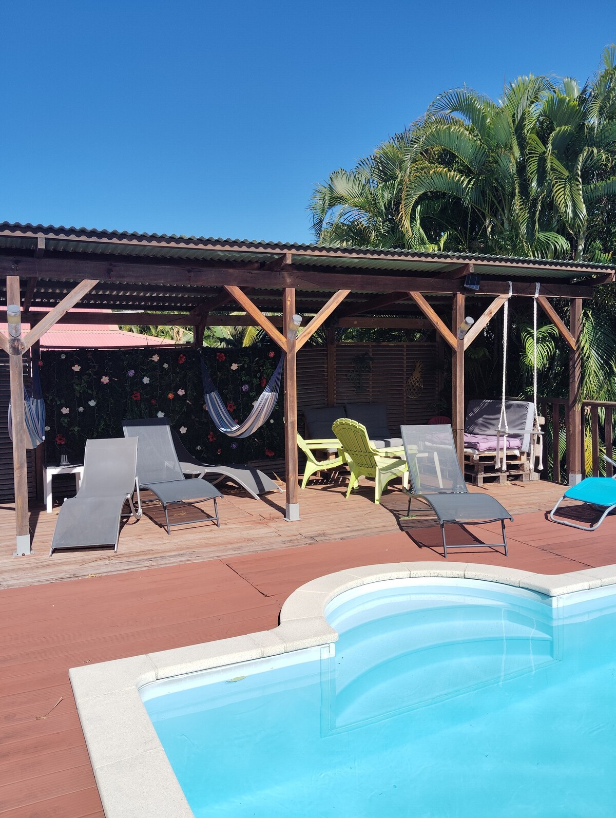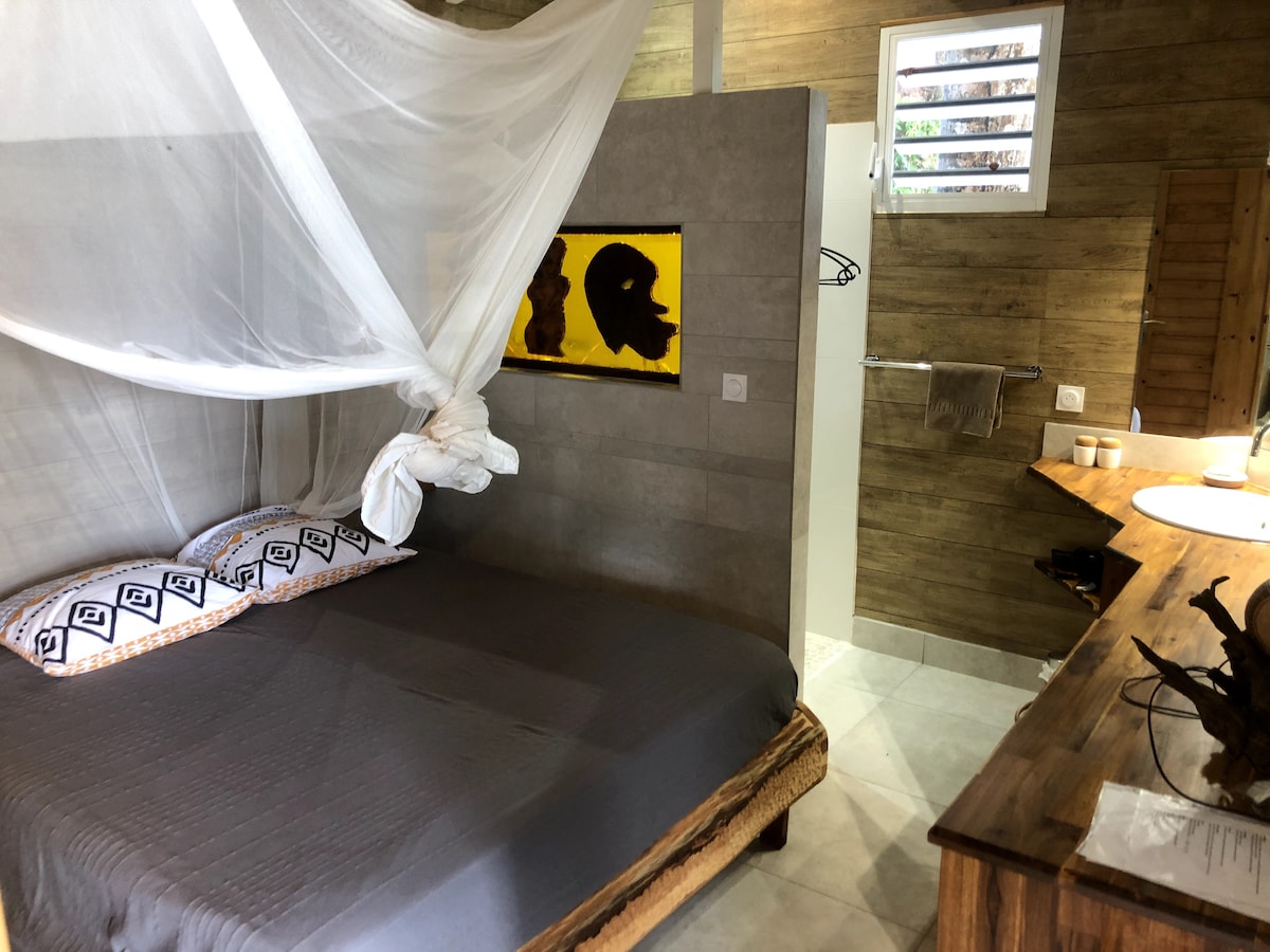 Chúng tôi chào đón bạn tại một trong 3 nhà nghỉ thôn dã của chúng tôi, nép mình trong trung tâm của một khu vườn kỳ lạ. Nằm cách bãi biển Grande Anse 900 m giữa rừng nhiệt đới và biển Caribe, nó bao gồm một boong với bể bơi riêng, sân thượng, nhà bếp/ sảnh chờ và phòng ngủ chính có điều hòa nhiệt độ (giường 160) Thư giãn gần hồ bơi của bạn và thưởng thức cocktail chào mừng kèm theo chim ruồi, trước khi ra ngoài ghé thăm hòn đảo tuyệt vời của chúng tôi... Hẹn sớm gặp bạn ở Thiên đường...