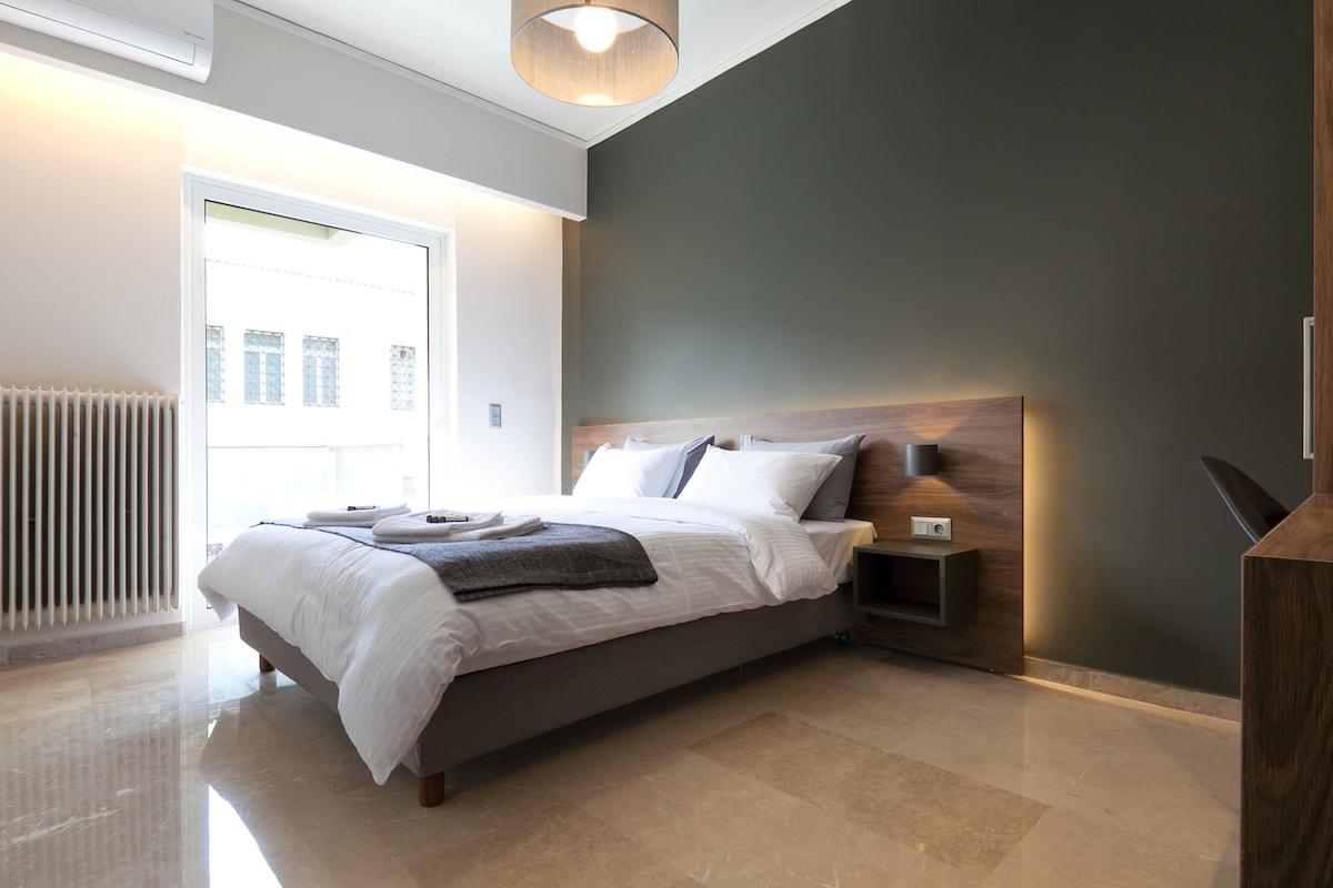 Elegant, modern apartment in Monastiraki, Athens' most central neighborhood. Located merely 300 meters from the Monastiraki subway station, our space offers brand-new hotel design with luxurious finishes. Ideal for a comfortable and memorable stay for a few days, weeks or even months, it beckons you to experience a stylish immersion into the very heart of Athens. Breathing new life into a mid-century textile manufacture, our building’s façade and overall architecture serves as a constant visual