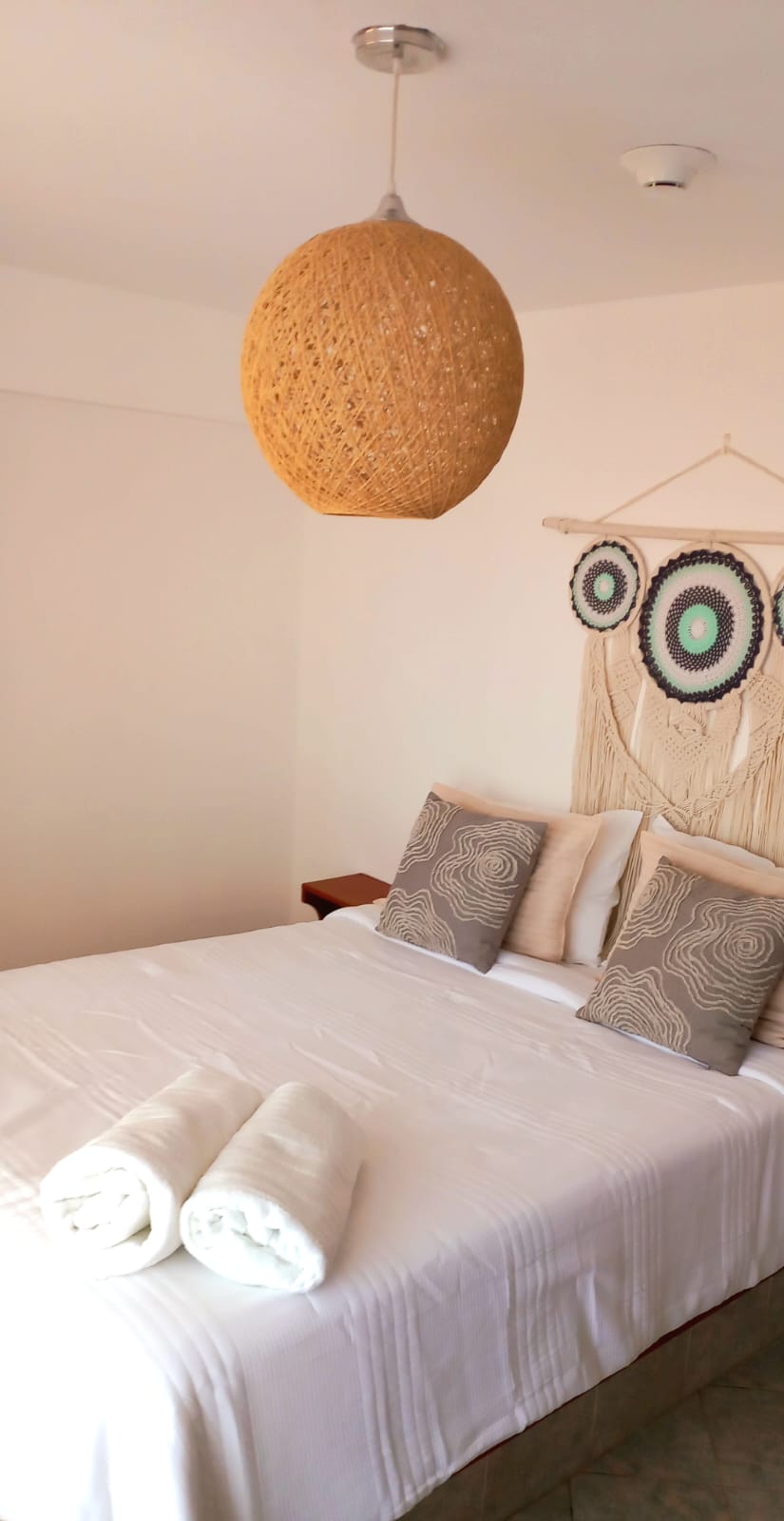Habitación Matrimonial cama de 2 plazas, baño propio con ducha agua caliente, jabón y shampoo, ubicada en el segundo piso vista a la ciudad. Smart Tv 55" Samsung 4K Crystal. Toallas de cuerpo, mano y pies, cortinas de tul y blackout, almohadas y cojines en la cama. Wifi alta velocidad en todo el Hotel.