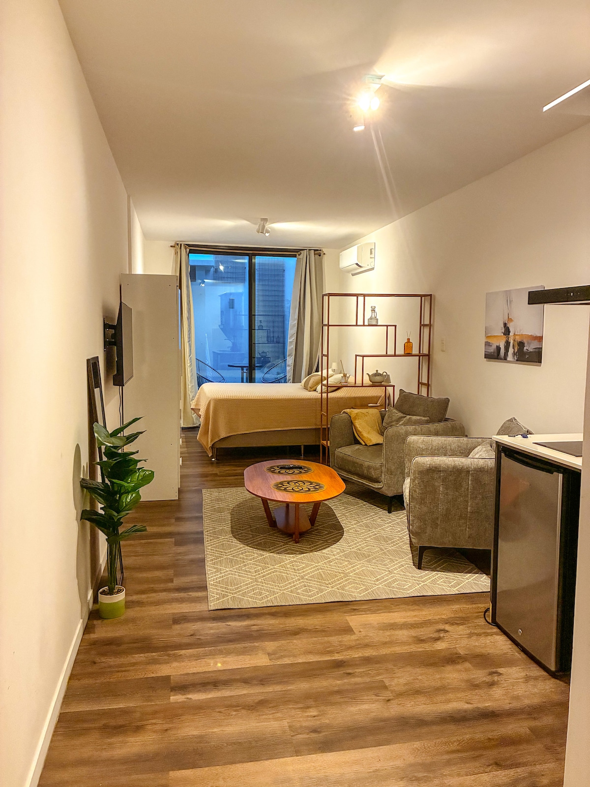 Studio thiết kế thoải mái và rộng rãi cách Trung tâm Thương mại Thế giới, khu vực Mua sắm & Nhà hàng/Quán rượu Montevideo năm dãy nhà. Rất sáng, có ban công. Gần các điểm dừng xe buýt đến tất cả các điểm trong thành phố. Nhà bếp được trang bị rất tốt với mọi thứ bạn cần để có thời gian lưu trú tốt. Giường đôi thoải mái và cũng có ghế sofa lớn, TV thông minh 55”, lò nướng điện tích hợp, máy giặt bên trong căn hộ và Wi-Fi tốc độ cao.