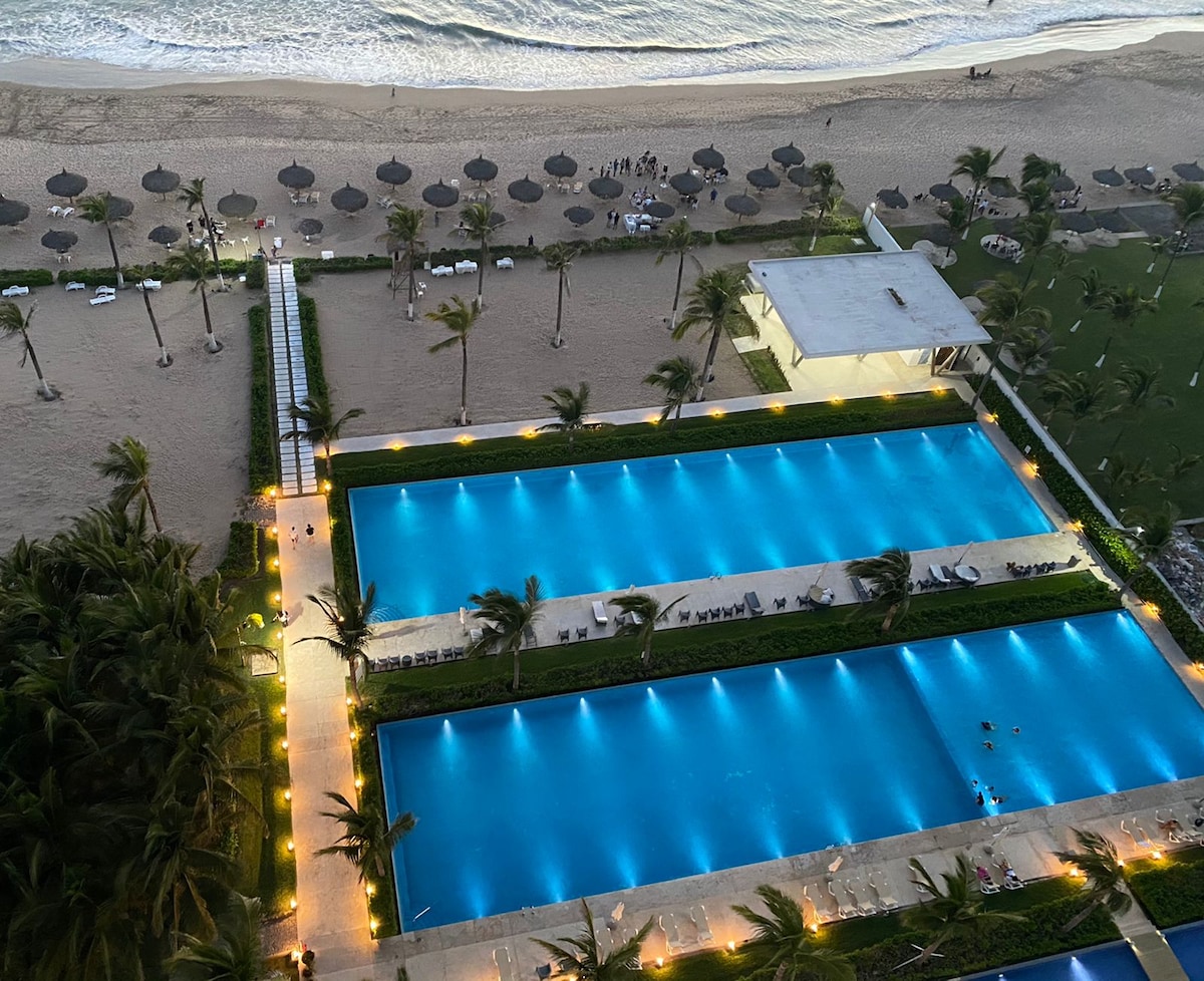 Trải nghiệm thức dậy với âm thanh của biển! Tận hưởng một căn hộ sang trọng dưới chân bãi biển với 3 phòng ngủ rộng rãi và 2 phòng tắm ở Península Nuevo Mazatlán, trong khu vực Cerritos độc quyền. Nằm ở Tầng 27, nơi đây có tầm nhìn toàn cảnh tuyệt đẹp ra đại dương. Thư giãn trong một không gian với tất cả các tiện nghi bạn cần: nhà bếp được trang bị, internet nhanh, điều hòa không khí và hơn thế nữa. Lý tưởng cho các gia đình, cặp đôi hoặc nhóm đang tìm kiếm một nơi nghỉ ngơi hoàn hảo bên bờ biển.