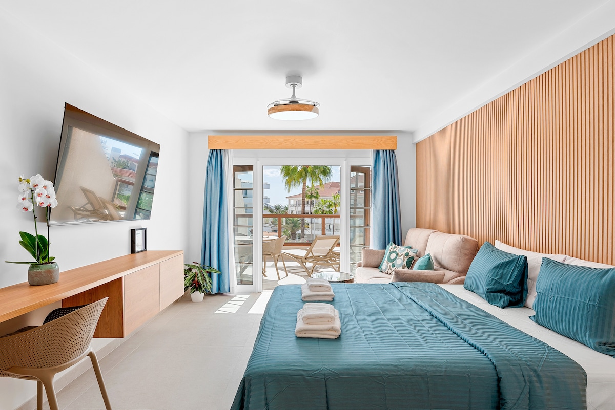 Trải nghiệm sự thoải mái trong Mint Studio của chúng tôi (bố cục mặt bằng mở), nằm trong khu phức hợp Castle Harbour nổi tiếng ở Los Cristianos. ★“Căn hộ giống như những bức ảnh, rất sạch sẽ và được trang trí trang nhã.” 🌞 Lý do bạn sẽ thích Studio của chúng tôi: Giường cỡ ✅ King – Ngủ thoải mái Sân thượng ✅ đầy nắng – Thư giãn dưới ánh nắng mặt trời cả ngày TV màn hình phẳng ✅ 50 inch – Thư giãn với các chương trình của bạn Quạt ✅ trần – Thoải mái vào những ngày ấm áp Hồ ✅ bơi nước nóng – Quanh năm ✅ Chỗ đỗ xe - Miễn phí trong khu phức hợp hoặc đường phố gần đó Khu vực ✅ nấu ăn – Bếp nhỏ gọn