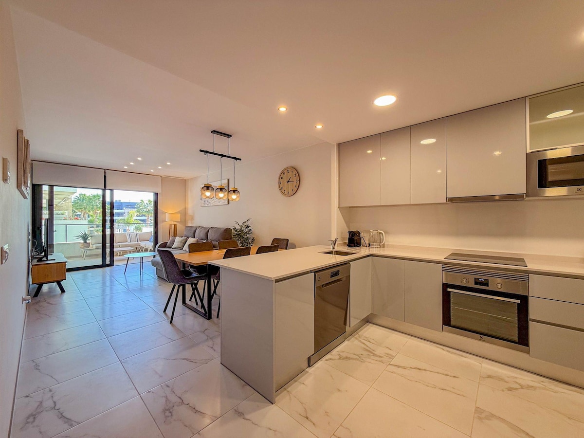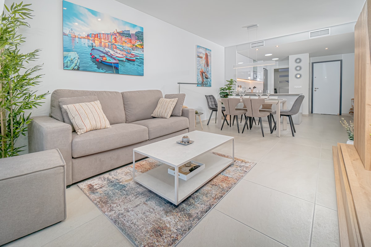 A modern, two-bedroom apartment with a spacious terrace in the heart of Playa Flamenca offers comfortable interiors, two bathrooms, a fully equipped kitchen, a washing machine, a hairdryer, a dishwasher, and air conditioning. Each bedroom and the living room feature a Smart TV. Complex amenities include pools - two of which are heated year-round — a jacuzzi, sauna, gym, playground, bar, and underground parking. Close to beaches, shops and restaurants. Perfect for an unforgettable stay!