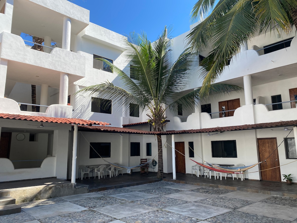 Tọa lạc tại Punta de Mita, khách sạn La Quinta del Sol nằm ngay đối diện bãi biển với tầm nhìn ra đại dương từ tất cả 7 phòng theo phong cách studio. Phòng tầng trên đi kèm với 1 giường queen (tối đa 2 khách), nhà bếp, điều hòa nhiệt độ, wifi và tầm nhìn tuyệt vời từ ban công lớn, chung. Tiện nghi bao gồm sàn mái và câu lạc bộ bãi biển với võng, ô, palapas và bbq. Gần nhiều giờ nghỉ lướt sóng đáng kinh ngạc và 3 phút đi bộ đến nhà hàng và cửa hàng. Chủ nhà sống tại chỗ. Tận hưởng một căn hộ riêng tư một cách dễ dàng của một khách sạn!
