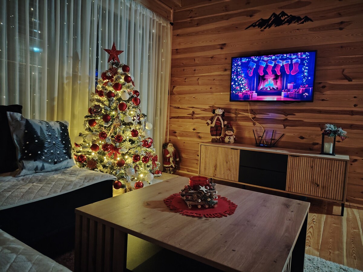 Tận hưởng một căn nhà gỗ chalet được trang trí thanh lịch được xây dựng bằng gỗ và đá, với một phòng trưng bày và tầm nhìn toàn cảnh. Tầng trên có một giường đôi, trong khi ở tầng trệt có một phòng khách rộng rãi với bếp, khu vực ăn uống và sofa giường (phù hợp cho 1 người lớn hoặc 2 trẻ em). Khách có thể sử dụng phòng tắm hiện đại, máy giặt, TV thông minh, WiFi, hệ thống sưởi/điều hòa không khí và bãi đỗ xe riêng có camera giám sát.