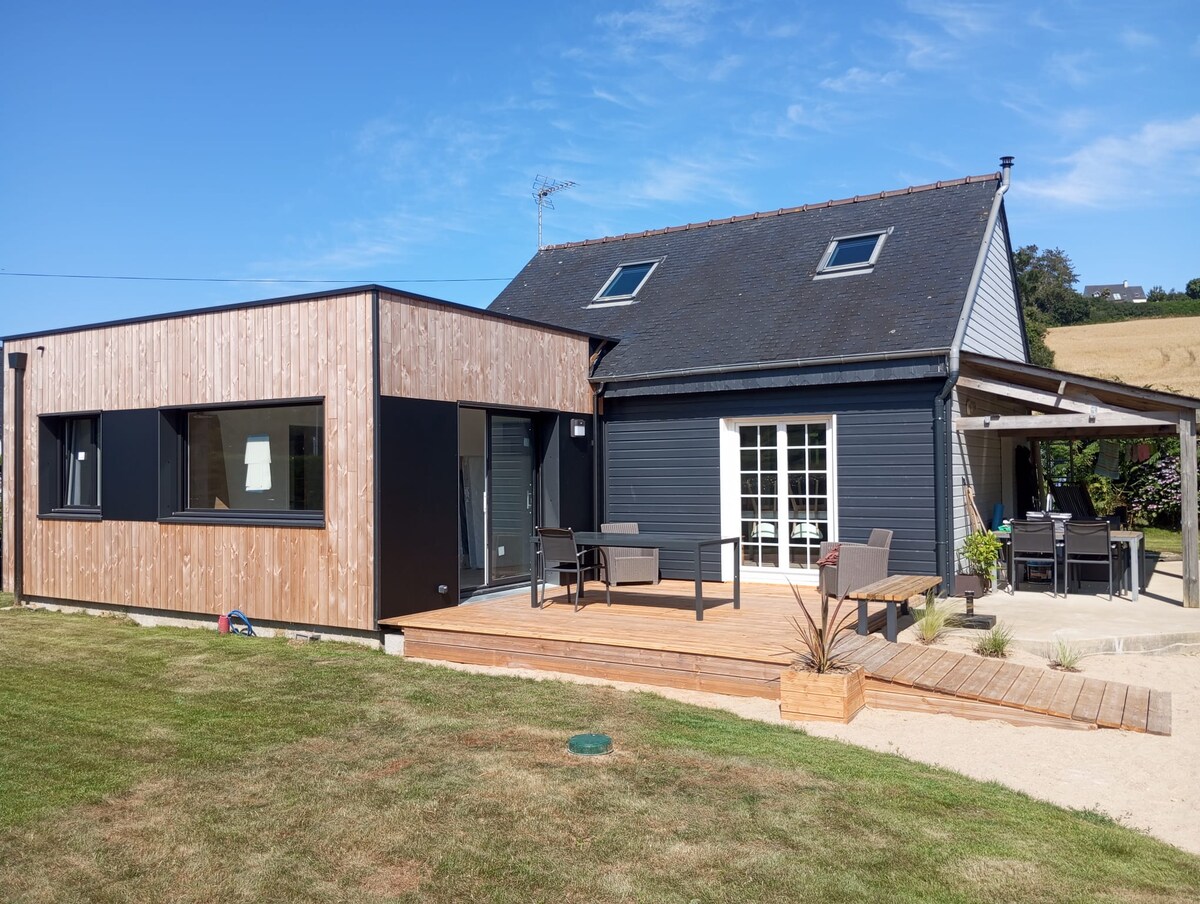 Ở Vịnh Morlaix Ngôi nhà mới tuyệt đẹp đã hoàn thành vào năm 2015 xây dựng gỗ , nhà thụ động,với sự thoải mái đi kèm với nó bạn sẽ cảm thấy như đang ở trên một chiếc thuyền với tầm nhìn ra biển đáng kinh ngạc,một cảnh quan thay đổi theo thủy triều và đi thẳng ra bãi biển. sân thượng về phía nam và khu vườn trên biển Bạn sẽ có tất cả các tiện nghi của một ngôi nhà hiện đại và tất cả các thiết bị đi kèm với nó Một bếp đốt củi cho các đợt bùng phát nhỏ vào mùa đông làm cho bầu không khí ấm áp