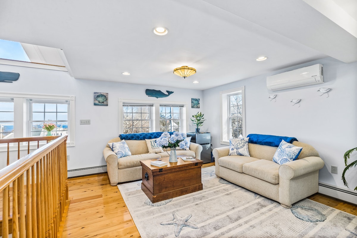The Boathouse was a part of the Manomet Coast Guard Station on Manomet Point. When the station was decommissioned and eventually dismantled, the Boathouse was moved and attached to our home as a separate space. Guests will have full and private access to this beautiful and spacious 1,800 square foot home with 11 foot vaulted ceilings and antique southern exposure windows. The open first floor has a living room, kitchen, pool table and bathroom. A spiral staircase leads to the bedroom.