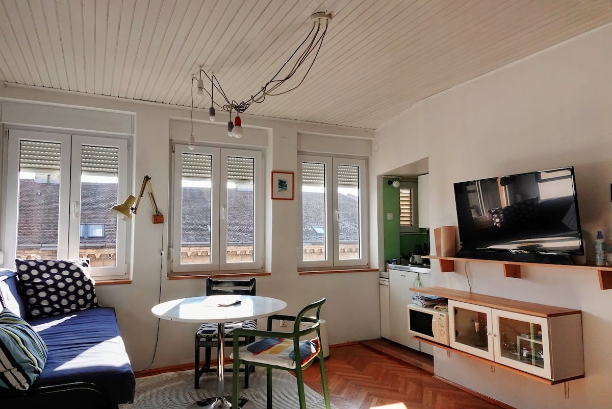 Apartment for relaxing and enjoying in the city center, Tkalčićeva ulica, in pedestrian area full with restaurants, cafés and souvenir shops. Open space concept. Including wellness room: combo sauna (Finnish and Infrared), bathtub for two and big walk in shower. Queen size bed and yoga chair for relaxing. It's on the fourth floor in the building without elevator. For your discretion entrance is with the digital lock at any time You like. Full equipped kitchen with all necessary appliances.