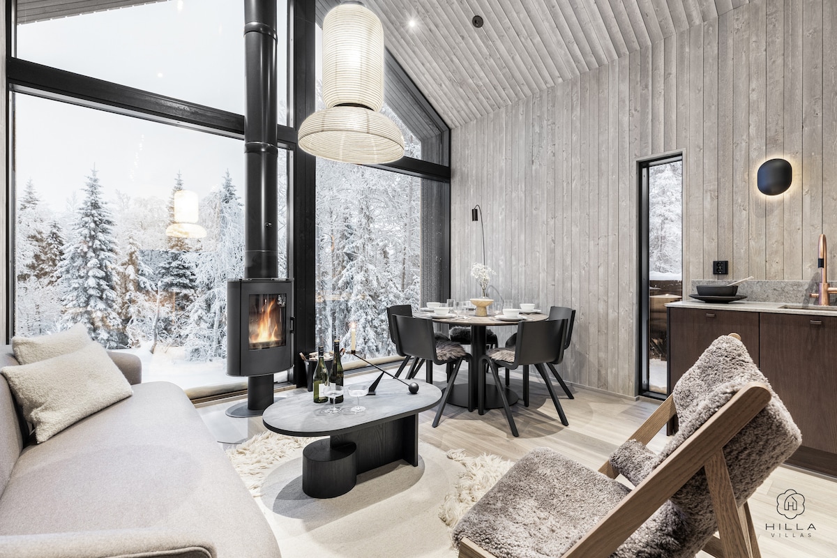 Ngắt kết nối với thế giới bên ngoài và tận hưởng sự riêng tư của cabin mới này, một nơi đặc biệt với những cây cao chót vót bao quanh bạn và một bồn tắm nước nóng sủi bọt để nâng cao trải nghiệm Lapland của bạn. Hãy tưởng tượng mỗi buổi sáng thức dậy với khung cảnh cây xanh rực rỡ hoặc phong cảnh phủ đầy tuyết, và sau đó giới thiệu một ngày của bạn với một buổi xông hơi nhẹ nhàng. Bên trong, bạn sẽ khám phá một khu vực rộng 56 m2, có tường màu xanh lá cây Naava, HDTV và Wi-Fi 100 Mbps! Chúng tôi cũng thuê một chiếc xe hơi!