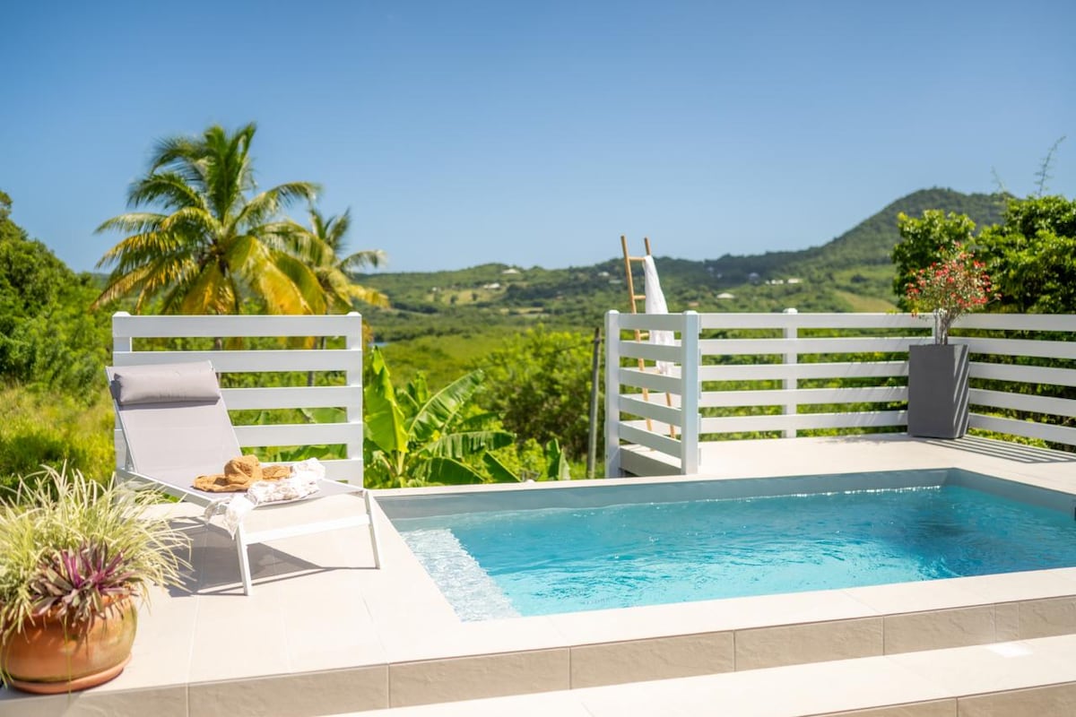 Biệt thự quyến rũ trên đồi với tầm nhìn tuyệt vời ra vịnh. Tận hưởng hồ bơi riêng và hai phòng ngủ khép kín, giường/ghế sofa thứ ba trong phòng khách. Vì thành phố của chúng tôi nằm trong khoảng cách đi bộ từ Anse à l 'Ane, chúng tôi có thể thưởng thức các cửa hàng, nhà hàng và tiệm bánh ở đó. Bạn cũng có thể đăng ký câu lạc bộ lặn, tham gia các tour tham quan cá heo và đi tàu con thoi hàng hải đến Fort de France và Anses lân cận.