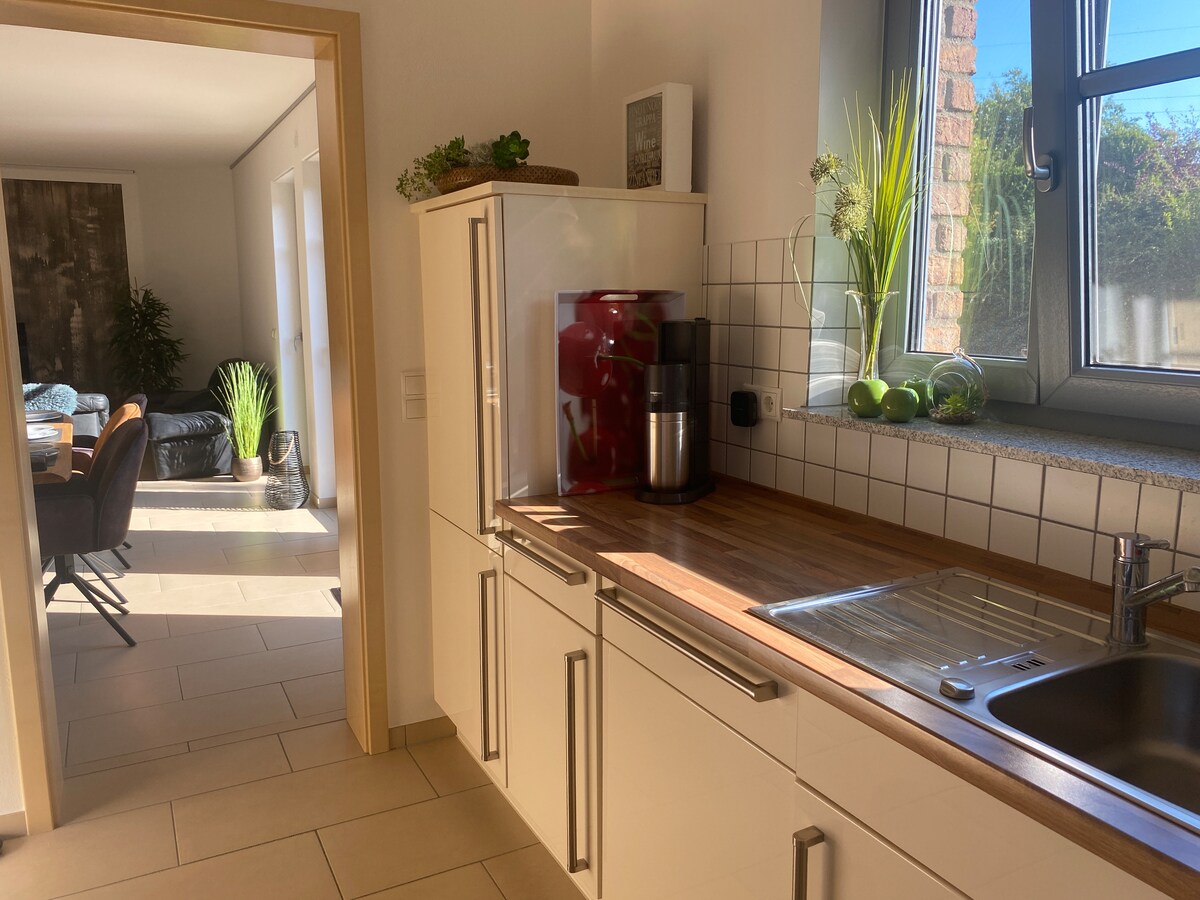 Căn hộ 82 m2 với lối vào riêng biệt là một phần của bungalow kiểu Bauhaus của chúng tôi. Nhà ở vùng nông thôn, rất yên tĩnh, cách Nürburgring 7 km. Cả những người đam mê đua xe và người đi bộ đường dài và người đi xe đạp sẽ tìm thấy nơi lý tưởng ở đây. Đường mòn trong mơ, Hohe Acht, Laacher See và Maare ở Volcanic Eifel. Căn hộ có thể chứa 5 người (1 giường đôi, 1 giường đơn & 1 giường kéo ra) và có phòng khách - phòng ăn, nhà bếp, phòng tắm (vòi sen, bồn tắm), nhà vệ sinh cho khách, sân thượng riêng.
