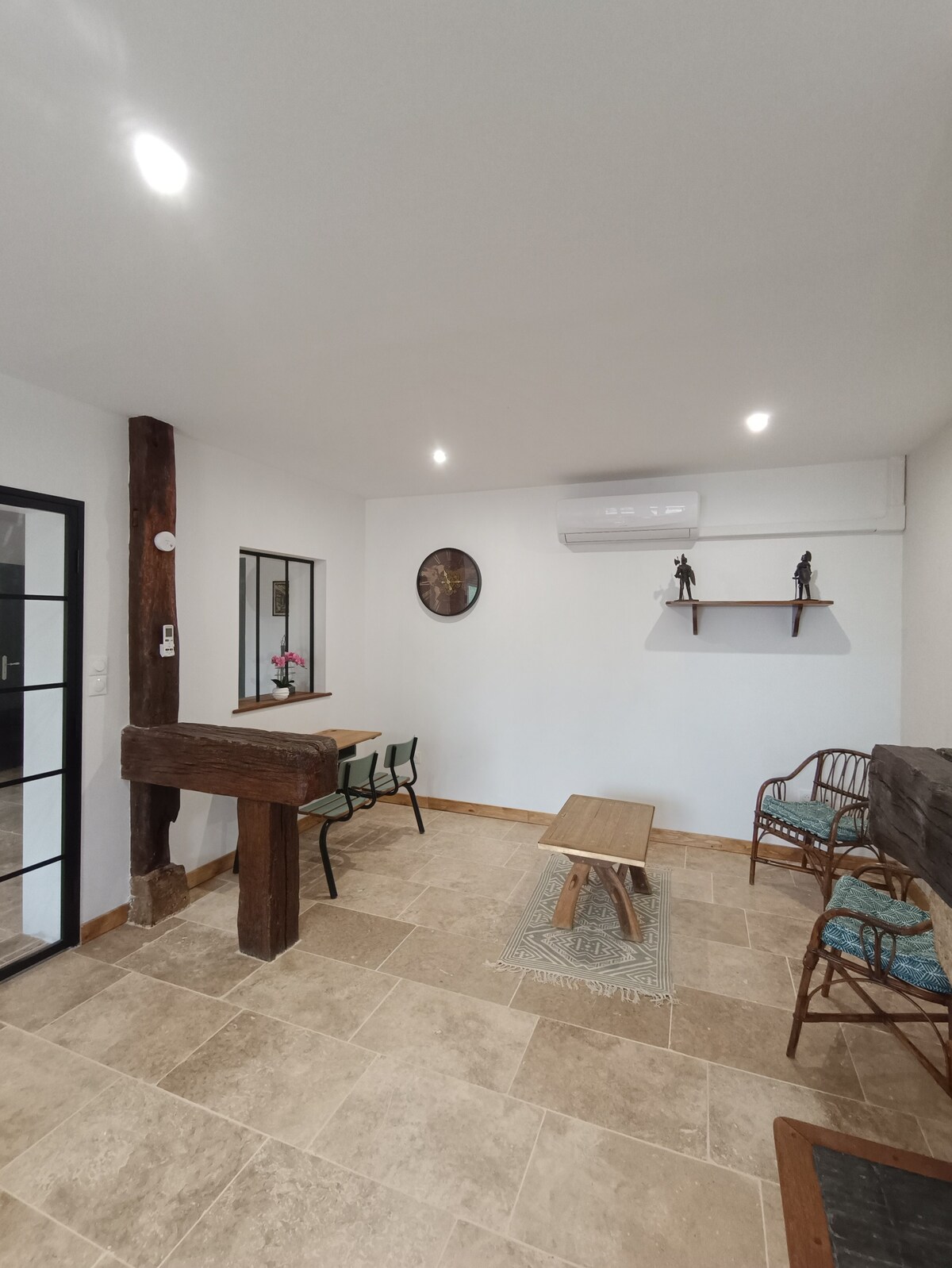 Căn hộ tầng trệt, có điều hòa không khí, hoàn toàn độc lập (tự nhận phòng) và bao gồm một phòng ngủ lớn: giường cỡ king với TV 40", phòng tắm có bồn cầu, bếp mở ra phòng khách với ghế sofa chuyển đổi 1,60 m chất lượng tốt với bọt nhớ. 1 cửa sổ nhìn ra bên ngoài. Chỗ ở có 2 chỗ đỗ xe trong sân kín (video). Chỗ ở có một cái ao nơi có thể đi bộ và ngắm🦆🐿️ sóc chúng tôi cung cấp khăn trải giường