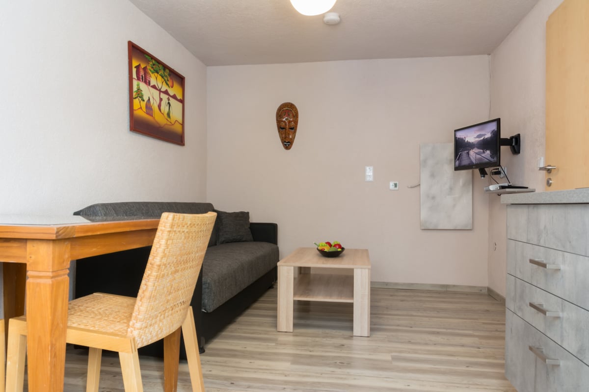 Die Einzimmer-Apartment kombinieren Wohnen, Schlafen und Kochen in einem offenen Raumkonzept. Ideal für Alleinreisende oder kürzere Aufenthalte. Auch hier erwartet Sie moderne Ausstattung, eine funktionale Küche, hochwertiger Bodenbelag und ein helles, neues Bad. Highlights: Offener Wohn- und Schlafbereich Eigene Küche mit modernen Geräten Helles Bad mit Dusche/WC Smart-TV und kostenloses Internet Waschmaschine im Haus Aufzug im Gebäude