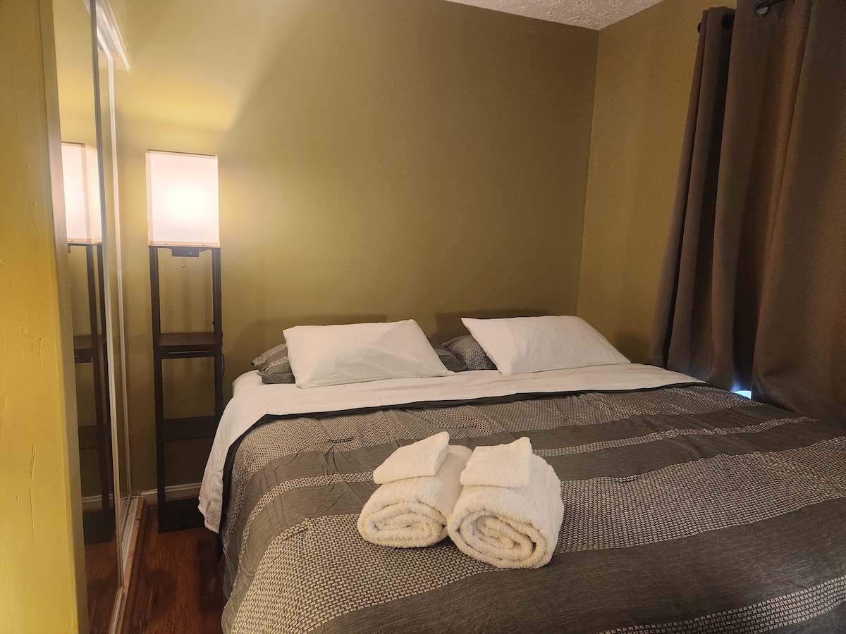 Phòng ấm cúng và ấm cúng với giường cỡ King và khóa cửa.