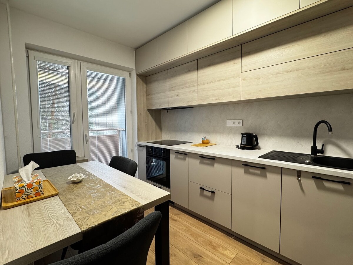 Căn hộ 2 phòng ngủ với giường đôi và 2 giường đơn với tùy chọn cho người thứ 5 có giường có thể thu lại. Gần đây đã được cải tạo với nhà bếp và ban công đầy đủ tiện nghi. Phòng khách rộng rãi. Wi-Fi và TV nhanh. Tuyệt đối không - Căn hộ hút thuốc. Cách bến xe buýt và cửa hàng tạp hóa 2 phút đi bộ. Sân chơi cho các loại ngay dưới ban công.