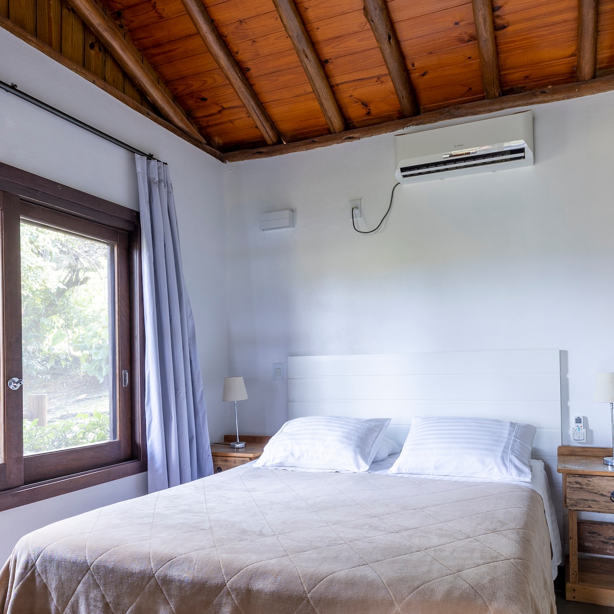 Nossas acomodações são aconchegantes, possuem Ar-condicionado, SmartTV com Netflix e WIFI ultrarrápido. Cada Cabana é equipada com cama box com colchão premium e sofá cama, além de uma cozinha completa com cooktop, geladeira e demais utensílios. Temos um quiosque com churrasqueira compartilhada junto com espetos e grelha. Disponibilizamos uma área externa com piscina, jardim e redário. Oferecemos uma deliciosa cesta de café da manhã entregue todos os dias no seu chalé R$ 80,00 p/2 pessoas.