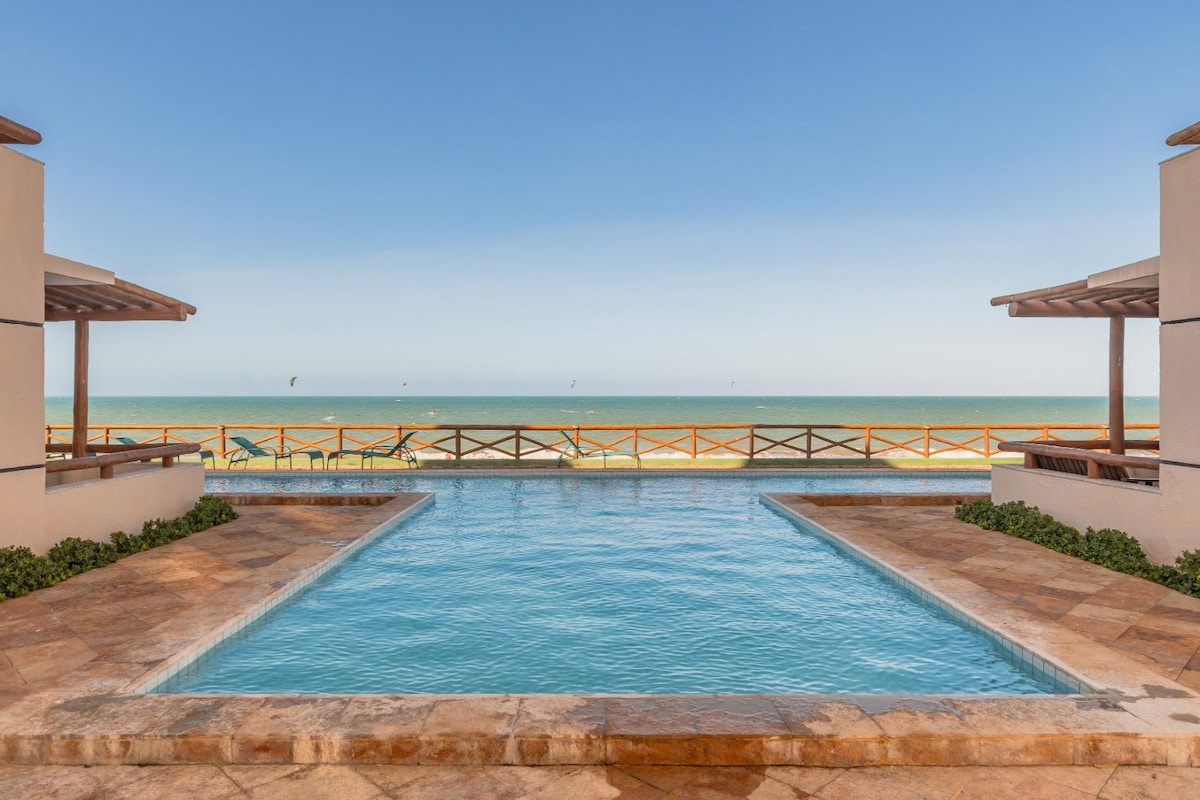 Ở tại địa điểm gần bãi biển nhất 🏖️ ở Cumbuco. Mở cửa sổ🪟 và tận hưởng gió biển 🌬️và âm thanh của sóng 🌊trực tiếp từ giường của bạn🛏️. Căn hộ rộng rãi (119 m²) trực tiếp trên bãi biển ở Cumbuco. 2 phòng ngủ, 2 phòng tắm, phòng khách lớn, mọi người đều có điều hòa nhiệt độ và sân thượng lớn với lối vào hồ bơi trực tiếp. Hoàn hảo cho thời gian lưu trú dài với máy giặt châu Âu, tủ lạnh lớn và tủ khóa diều riêng. Tận hưởng khung cảnh tuyệt đẹp và thư giãn trên sân thượng riêng của bạn