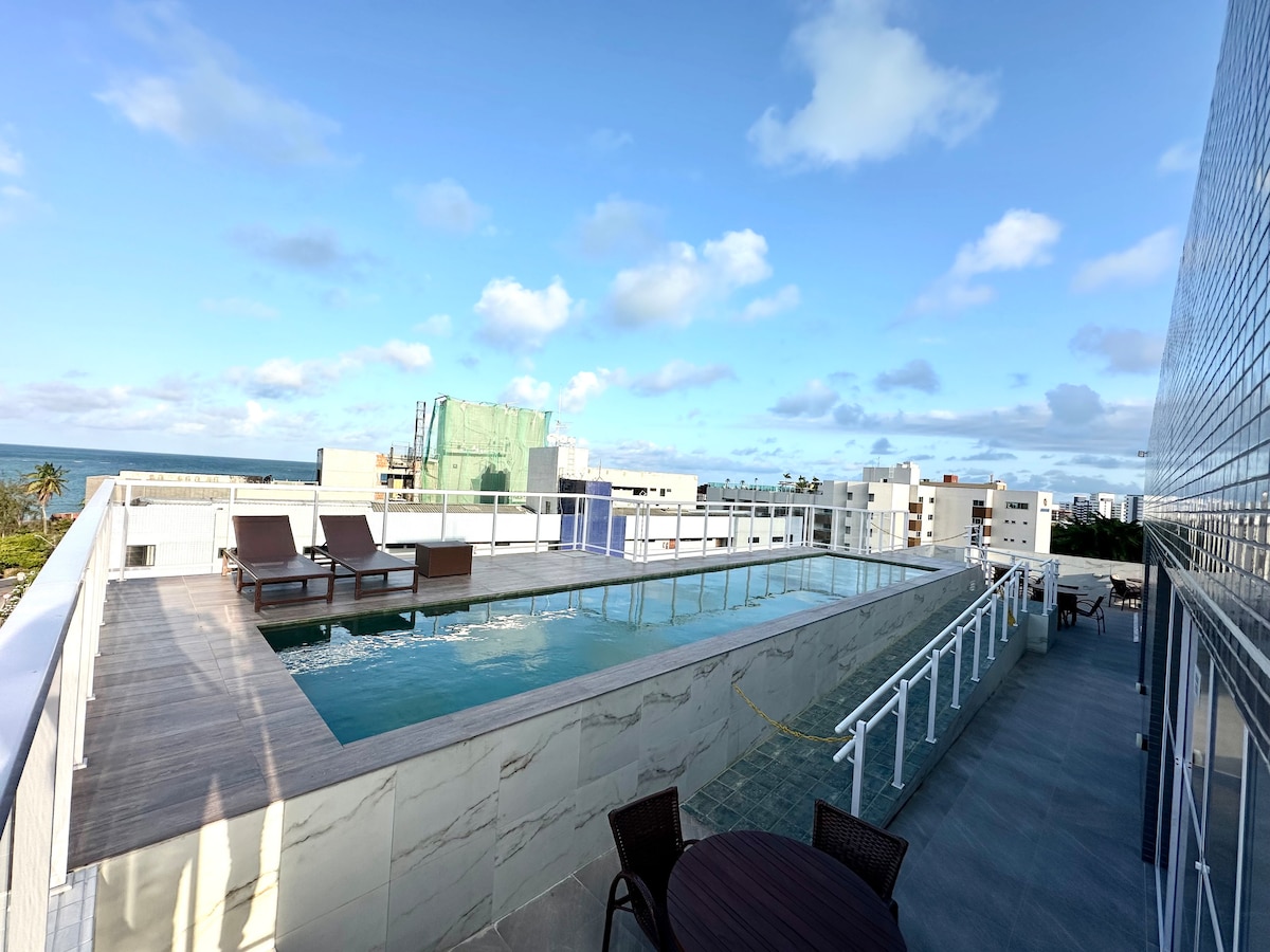 Flat Ocean's Sweet: Refugio Acolhedor em frente do mar! Em Férias ou a Negócios, perfeito para você, casal ou pequena família. Mergulhe na deslumbrante piscina de borda infinita com vista para mar ou a poucos passos aproveite a praia e sinta as ondas. Relaxe em um compacto e conectado espaço com cama de casal (e solteiro/a) e prática cozinha. Venha Viver esta Doce experiência. Reserve Agora!