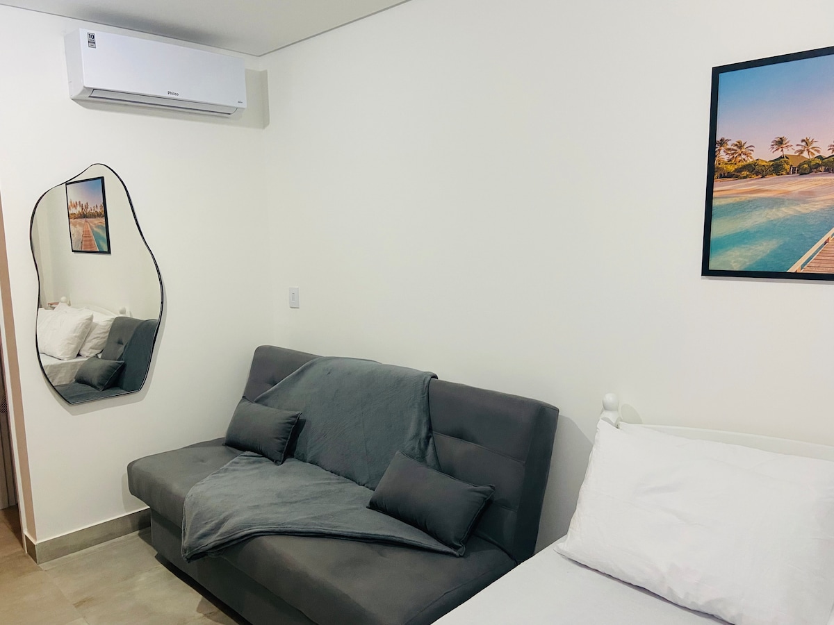 Căn hộ của chúng tôi rất ấm cúng, có chỗ ở cho 02 người bao gồm giường đôi, giường sofa và nệm, TV, tủ quần áo, bếp đầy đủ, có tủ lạnh, bếp, lò vi sóng và tất cả các dụng cụ cần thiết để hoạt động đầy đủ. Khăn trải giường được tạo thành từ ga trải giường, ga trải giường, gối có vỏ gối và khăn tắm toàn thân và mặt. Lưu ý: Điện sẽ bị tính phí riêng theo mức tiêu thụ của bạn, trong đó mỗi 1kwh tiêu thụ trả R$ 1,10.