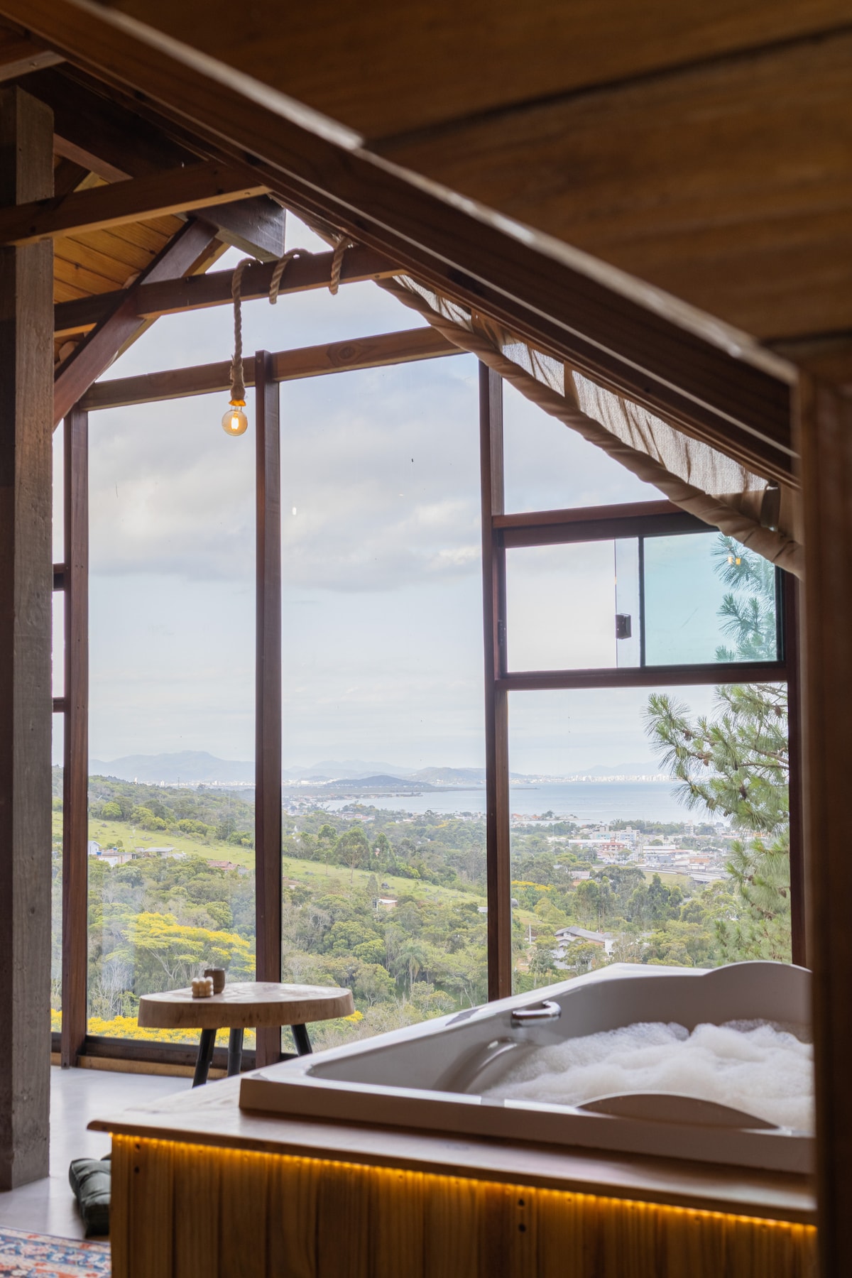 Chalé Céu da Colina – Nơi trú ẩn với tầm nhìn ra núi ra biển. Tọa lạc tại Sítio Vale Encantado, Palhoça–SC, cách BR-101 1 km, trên một con đường yên tĩnh. Nằm trên căn penthouse của nhà trọ, đây là nơi lý tưởng cho các cặp đôi và có tầm nhìn ngoạn mục. Môi trường: sảnh vào, khu vực nhà tích hợp, bếp đầy đủ và ban công có xích đu. Tiện nghi: bồn tắm nước nóng với tầm nhìn, ga trải giường và khăn tắm, kính viễn vọng và lò sưởi ngoài trời. Gần thác nước và các bãi biển chính của khu vực phía Nam.