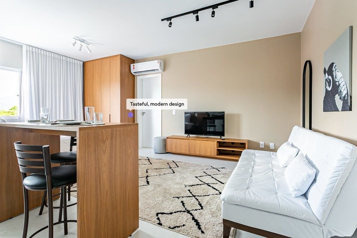 Thức dậy với âm thanh của biển và một khung cảnh thực sự đậm chất điện ảnh. Trải nghiệm ven biển của bạn ở Jurerê bắt đầu từ đây: Căn hộ có tầm nhìn toàn cảnh, tầm nhìn ra đại dương tuyệt đẹp, cả từ phòng ngủ và từ phòng khách được tích hợp với nhà bếp. Lý tưởng cho các cặp đôi hoặc gia đình, có thể ở tối đa 5 người. Tại Jurerê Beach Village, một khách sạn ven biển, bạn có thể tận hưởng lối đi thẳng ra bãi biển, hồ bơi nước nóng, các hồ bơi khác, nhà hàng, phòng vui chơi và nhiều dịch vụ khác giúp thời gian lưu trú của bạn nhẹ nhàng, thoải mái và khó quên.