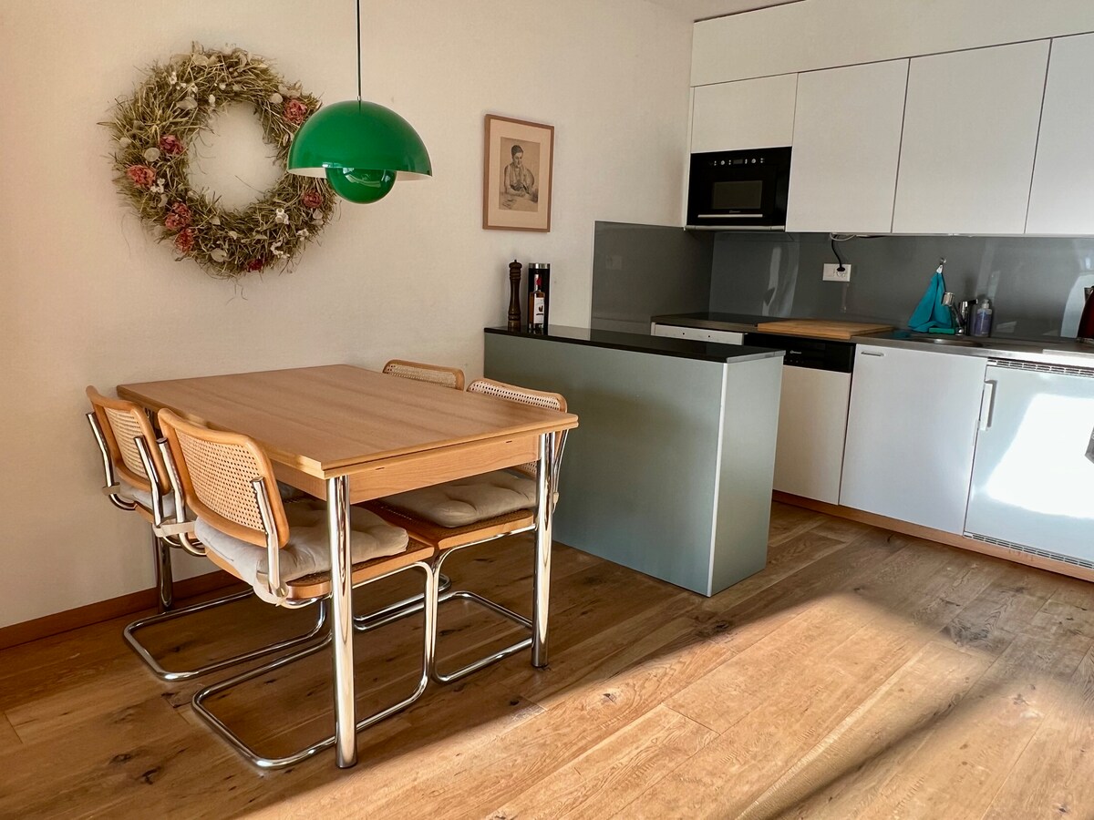 Căn hộ 2 phòng ngủ mới được cải tạo, nằm ở vị trí rất trung tâm, với tầm nhìn tuyệt đẹp ra núi. Sử dụng phòng xông hơi khô, phòng tập thể dục và hồ bơi (đóng cửa vào mùa thấp điểm). Ga tàu, Coop, Gotschnabahn, trượt tuyết xuyên quốc gia, quần vợt, v.v. tất cả đều cách đó 5 phút đi bộ. Có chỗ đỗ xe ngầm. Nhỏ nhưng đẹp. Bạn có mọi thứ cần thiết Căn hộ không được hoàn tiền.