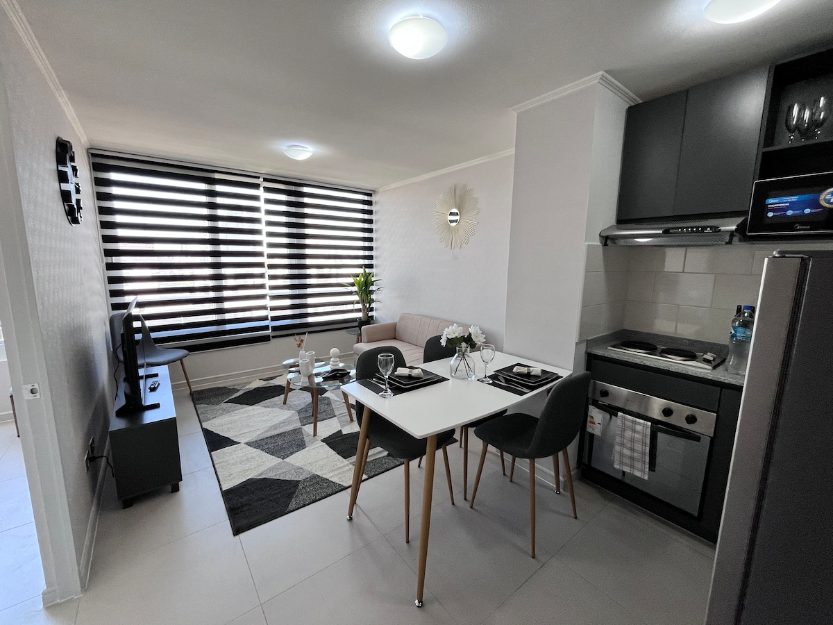 Căn hộ hiện đại và ấm cúng với điều hòa không khí ngay trung tâm Santiago. Cách tàu điện ngầm và Trung tâm lịch sử vài bước chân, được bao quanh bởi các bảo tàng, chợ và nhà hàng. Giường cỡ King, bếp được trang bị, ban công và Wifi nhanh, lý tưởng cho các chuyến đi hoặc thời gian lưu trú dài. Tòa nhà an toàn với nhân viên hỗ trợ 24/7. Sự quan tâm cá nhân, nhận phòng linh hoạt và các đề xuất địa phương để bạn có thể tận hưởng thành phố như một cư dân, với sự thoải mái và yên tâm.