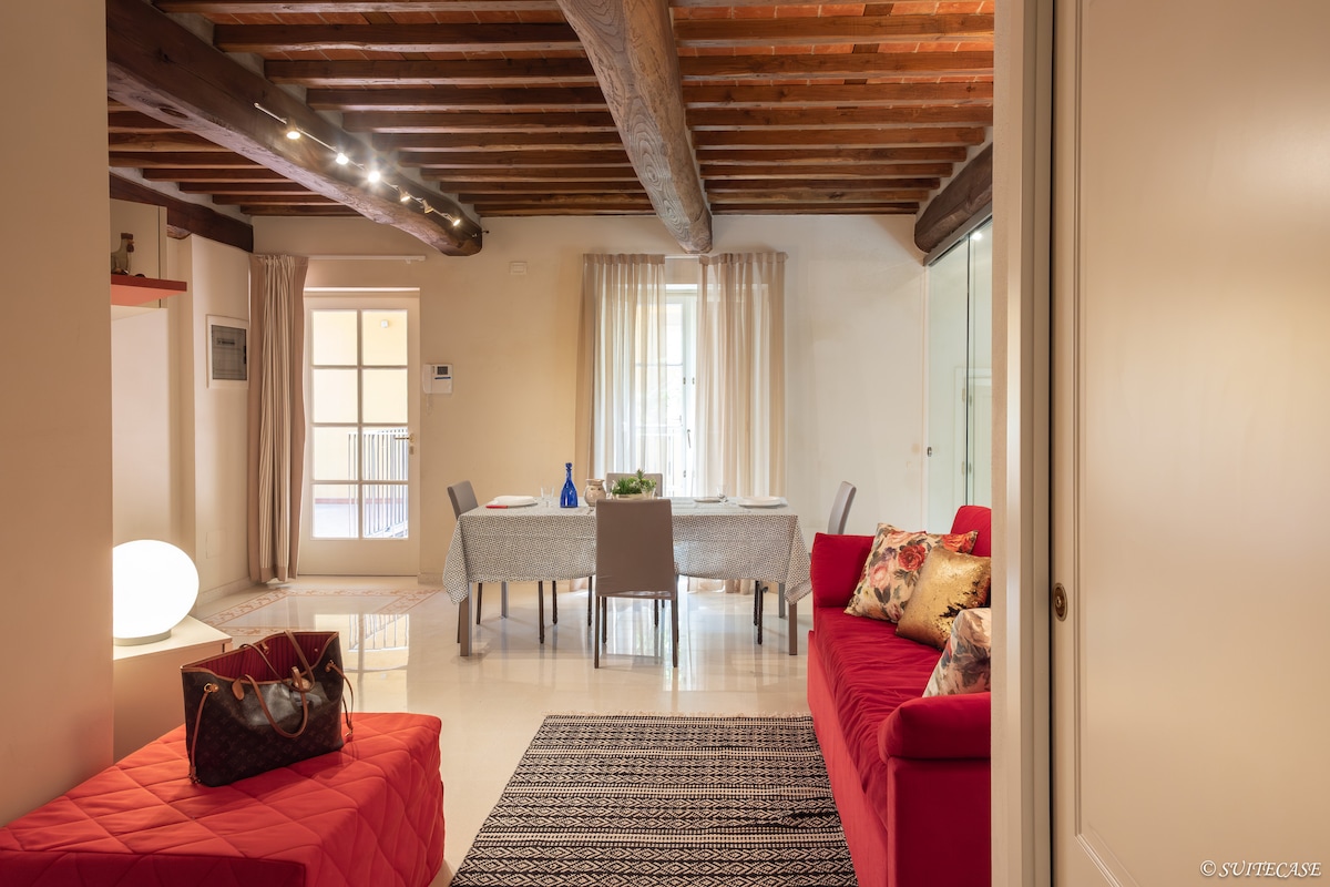 Elegant apartment set within one of Lucca’s most prestigious historic palaces, in the heart of the city center. Fully renovated, this refined 85 sqm residence hosts up to 4 guests, featuring two double bedrooms, a stylish bathroom with walk-in shower, bright living area and fully equipped kitchen. Access to a charming internal courtyard. Air conditioning, Wi-Fi and central heating ensure year-round comfort.