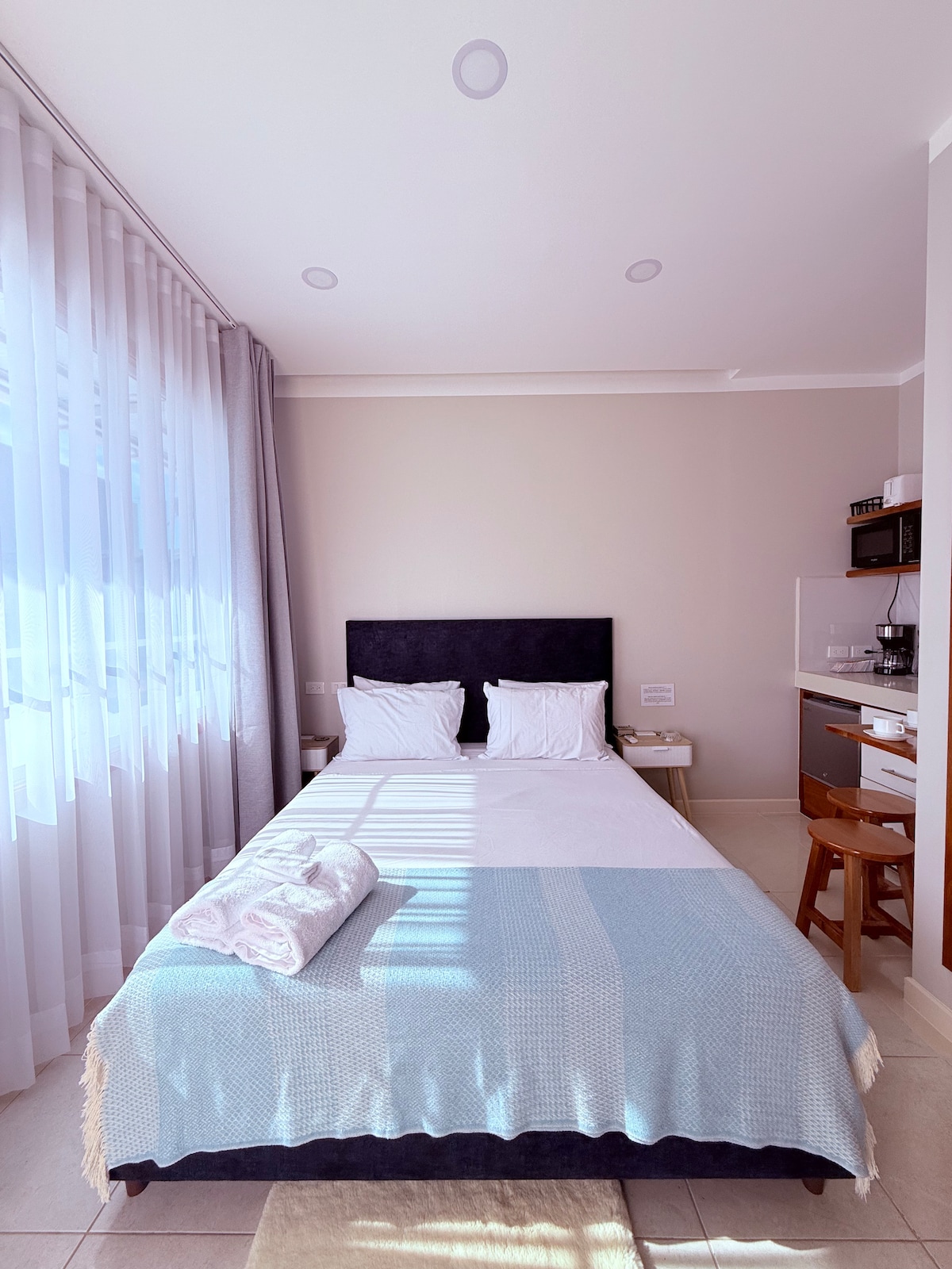 Esta ubicado a menos de 100 mts de la playa Man, el apartamento cuenta con una cómoda cama King, acceso al balcón propio con vista al mar, dispone de cortinas blackout, aire acondicionado y smart tv de 32'' con Netflix, en su refrigerador tendrás una botella de agua de cortesía por estadía, adicional a una cafetera para degustarte con un café molido de aroma, el baño privado con agua caliente, se brinda toallas y dispensador de jabón y shampoo..