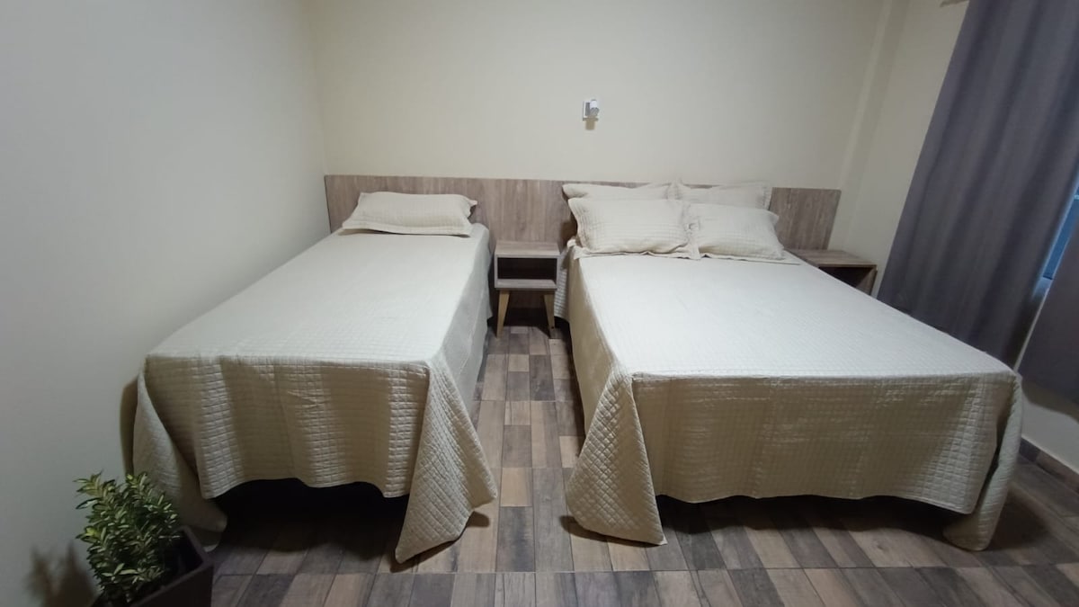 Phòng có một giường đôi + 2 giường đơn. Nó có Wi-Fi, điều hòa, TV thông minh và két sắt. Phòng tắm riêng bao gồm khăn tắm, dầu gội đầu, dầu xả, xà phòng và máy sấy tóc. Khu phức hợp nằm trên Avenida das Cataratas và cung cấp các tiện nghi để thuận tiện cho bạn. Trong tòa nhà, bạn sẽ tìm thấy dịch vụ giặt ủi tự phục vụ, đổi tiền, đại lý du lịch, cho thuê xe hơi, tàu điện ngầm và tiện lợi 24 giờ với máy ATM để ngân hàng bất cứ lúc nào.