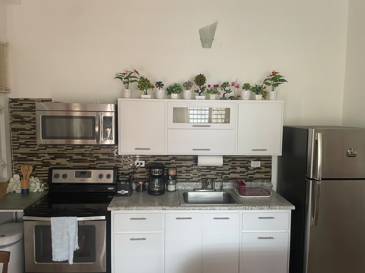 Studio ấm cúng ở tầng một, nhìn ra phong cảnh nhiệt đới và đại dương. Cách Sân bay San Juan Int 45 phút lái xe, Bãi biển Luquillo và Bãi biển Fajardo gần đó. Các điểm tham quan khác bao gồm el Yunque, cưỡi ngựa, lặn với ống thở, phà đến Vieques, Culebra và Đảo Icacos. Trở lại studio, bạn có thể tận hưởng giường cỡ queen cho 2 người và cũng có giường sofa kích thước đầy đủ (2 trẻ em dưới 6 tuổi sẽ phù hợp. Dịch vụ giặt là cho khách ở trên 4 ngày.