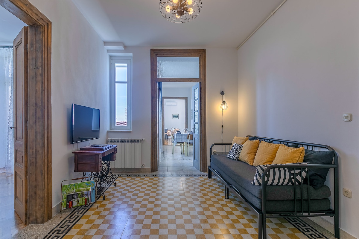 Căn hộ quyến rũ rộng 75 m² trên tầng ba của một trong những biệt thự Münz lịch sử, nằm ngay trung tâm thành phố Pula 3000 năm tuổi. Căn hộ nằm ngay cạnh nhà hát Pula, đối diện công viên, chỉ cách lối đi dạo ven biển một bước và cách khu phố cổ 5 phút đi bộ. Gần đó có ga xe lửa và xe buýt, bến phà và nhiều điểm tham quan văn hóa và du lịch. Từ ban công có thể nhìn thấy quang cảnh bến cảng tuyệt đẹp, khiến căn hộ này trở thành lựa chọn hoàn hảo cho những ai tìm kiếm sự yên bình và thoải mái.