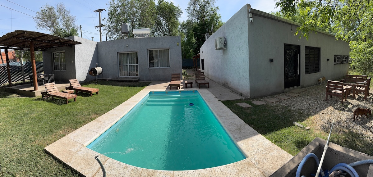 Casa con piscina compartida, con deck aterrazado y asador de uso exclusivo asador; vista a las sierras, cocina completa y artefactos de primera calidad. Capacidad hasta 8 personas. una cama matrimonial 6 individuales, dos de ellas camas marineras.